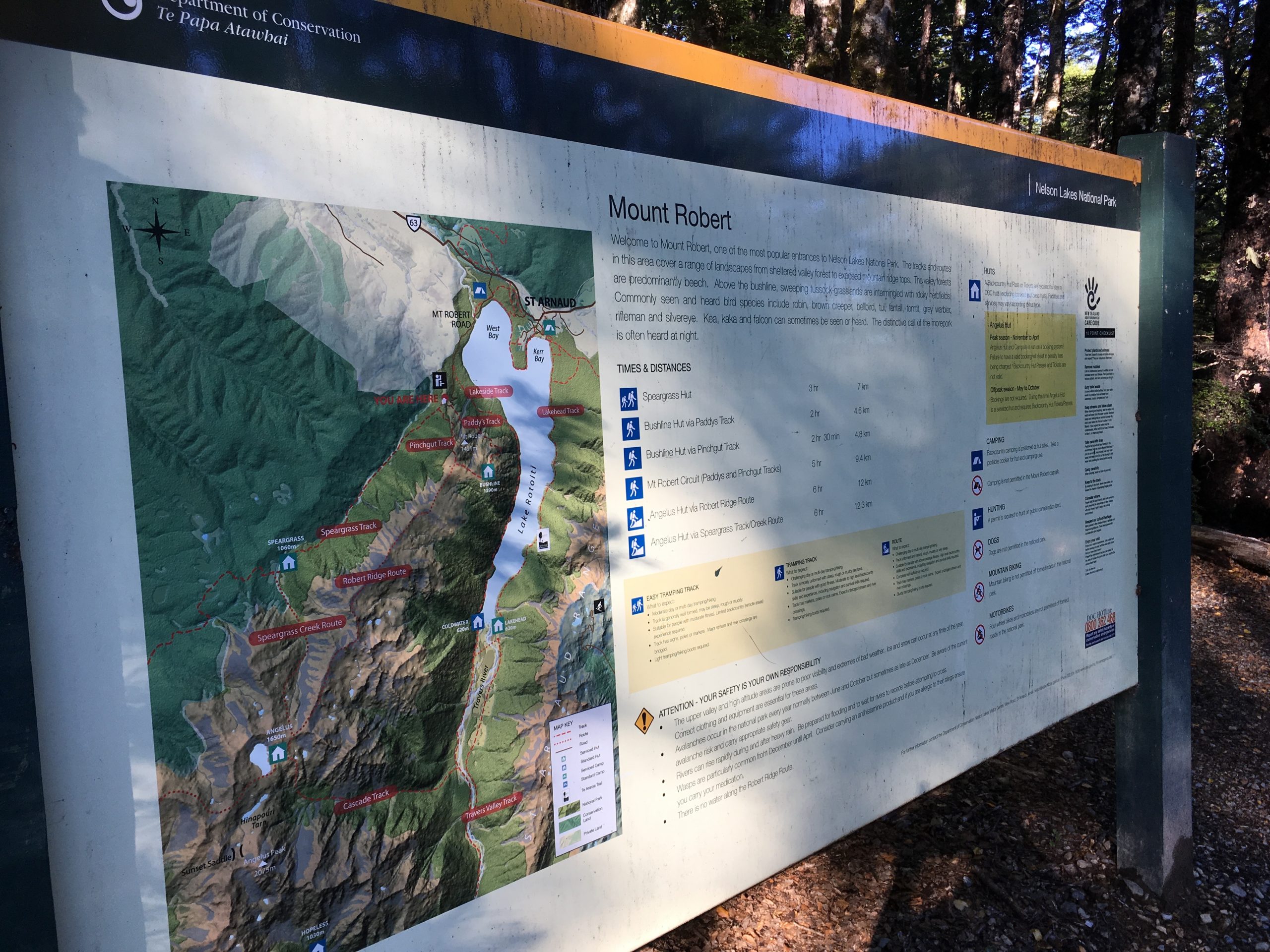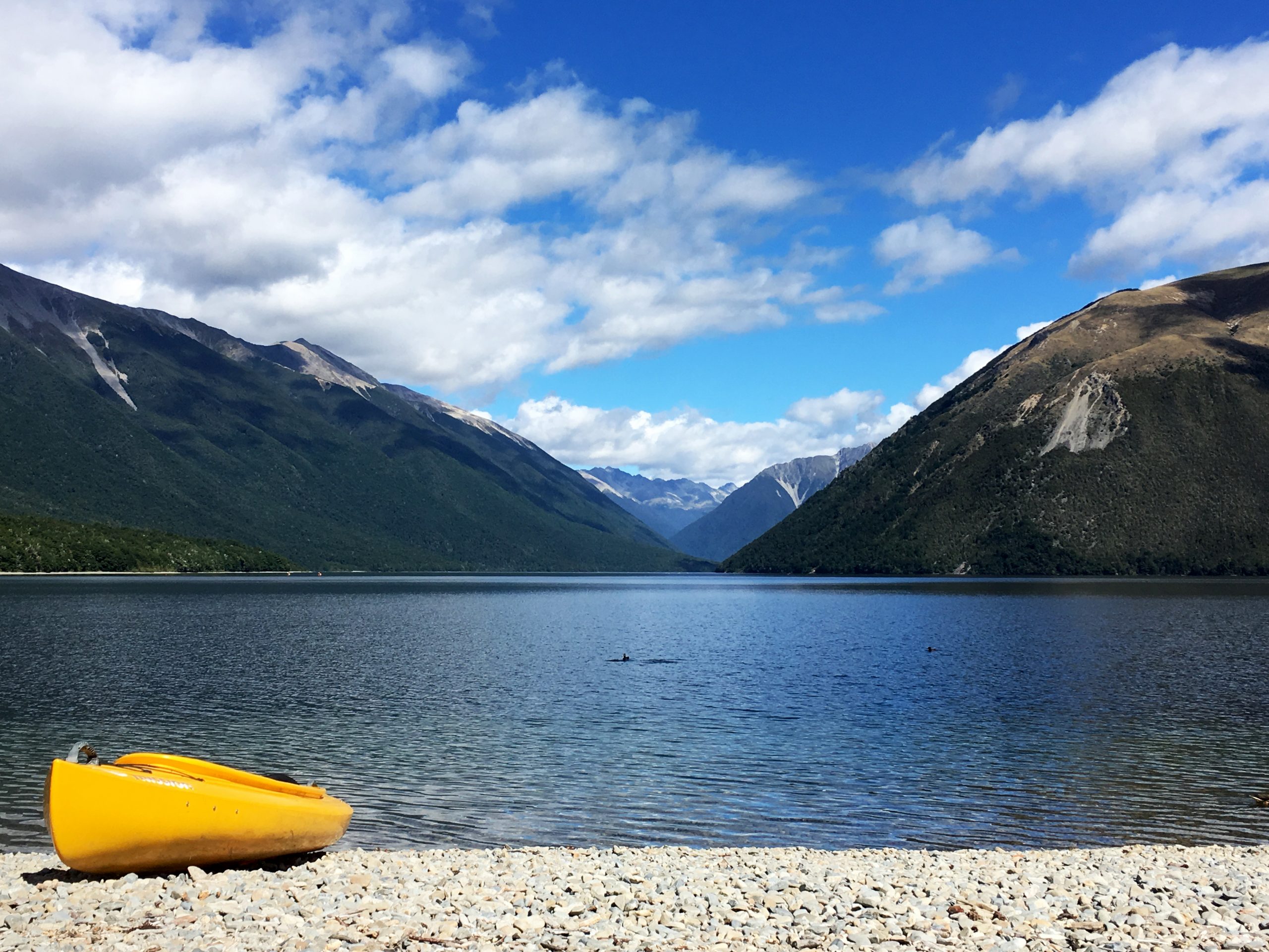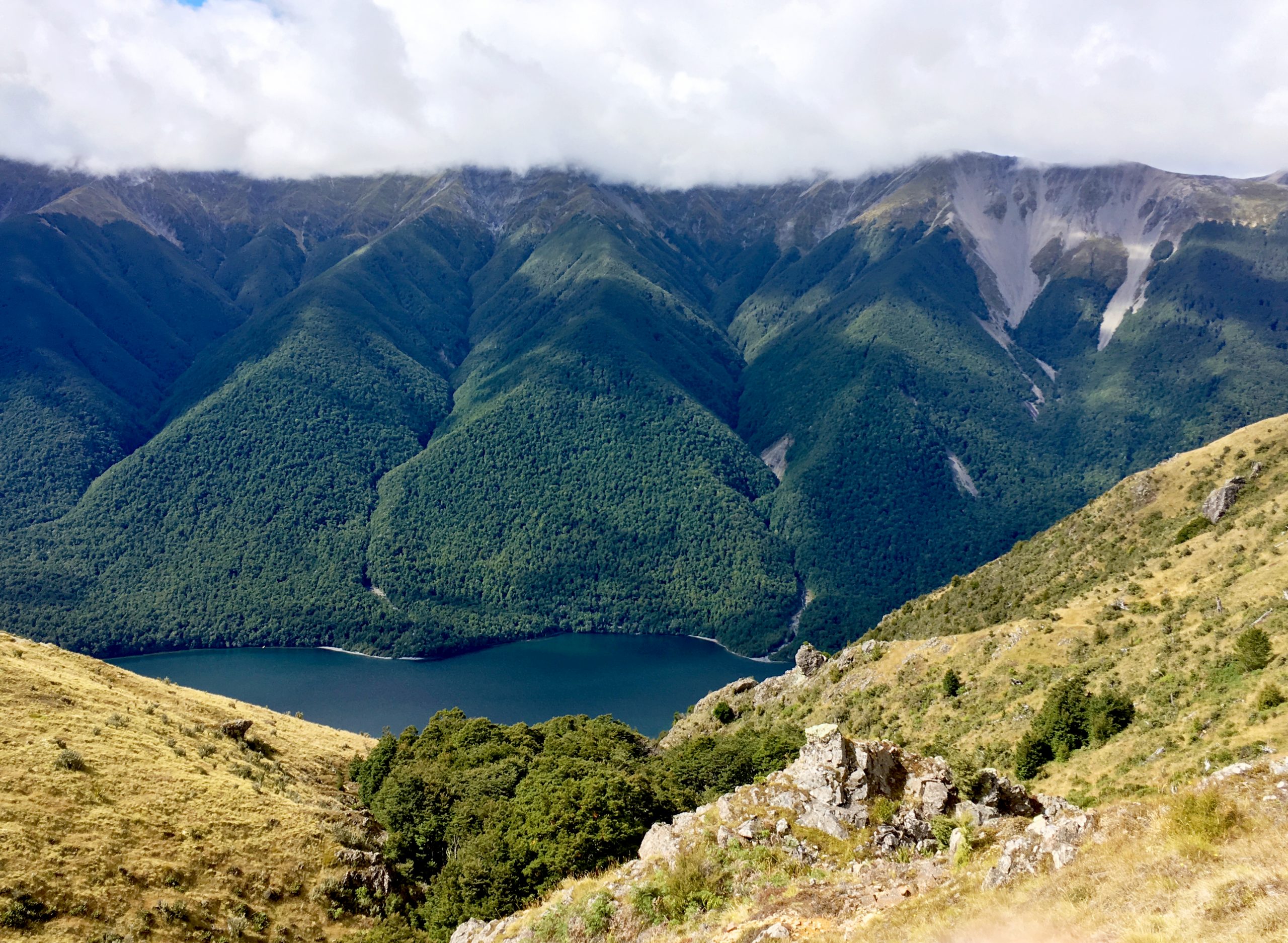 Au sud de Nelson se trouve Nelson Lakes National Park. Normalement, cette randonnée se fait sur plusieurs jours, avec la possibilité de dormir dans des « Huts », ce qui correspond à nos gîtes / refuges en France. Malheureusement je n’ai qu’un seul jour de congé, je m’aventure donc pour une marche de 5h pour gravir le Mount Robert. Le temps est encore une fois magnifique, la vue sur le lac est splendide.