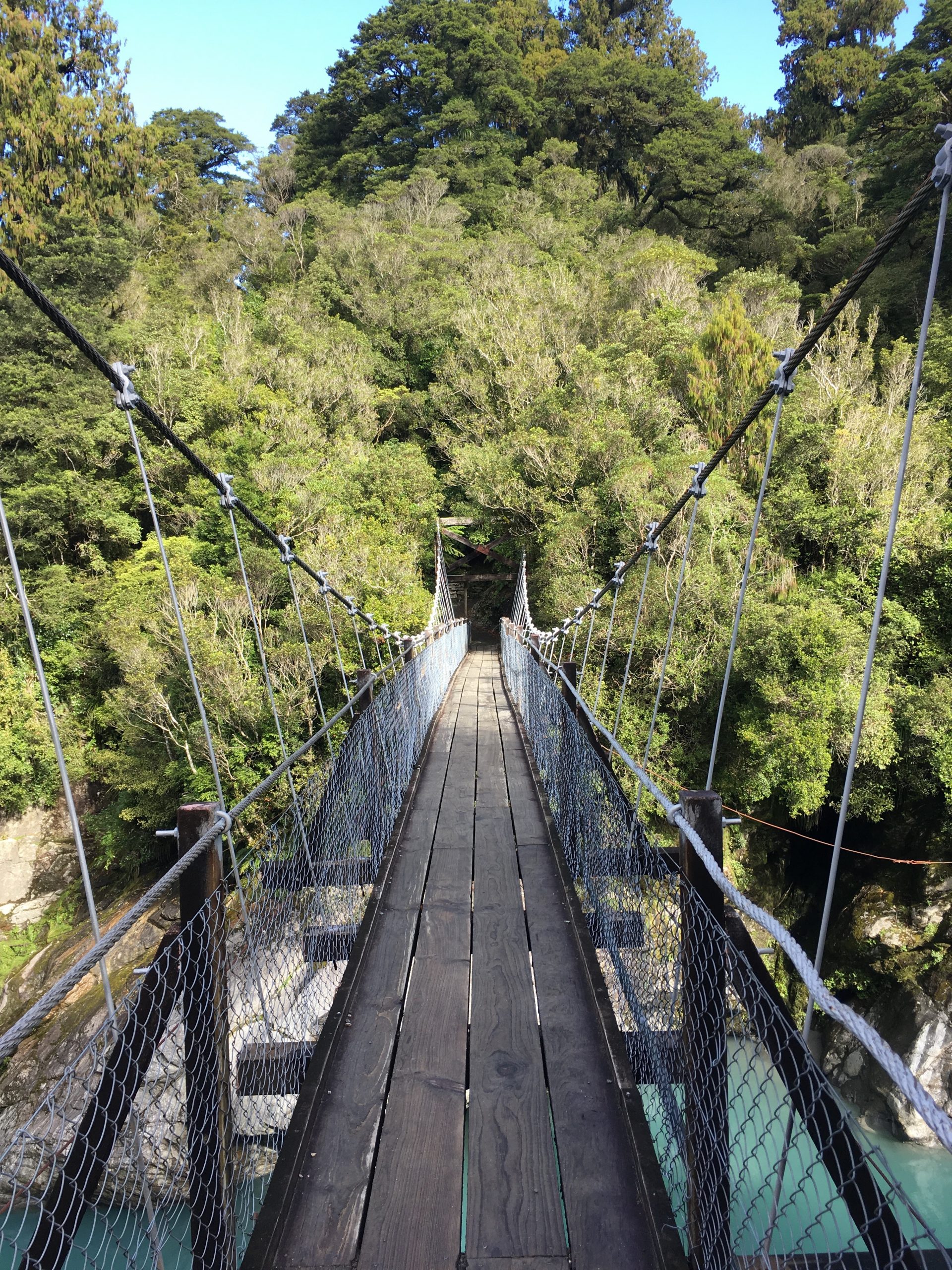 Sur le chemin, je m’arrête aux fameuses gorges d’Hokitika aux eaux bleues turquoises remarquables. L’attaque de sandflies me convainc de ne pas pique-niquer ici.