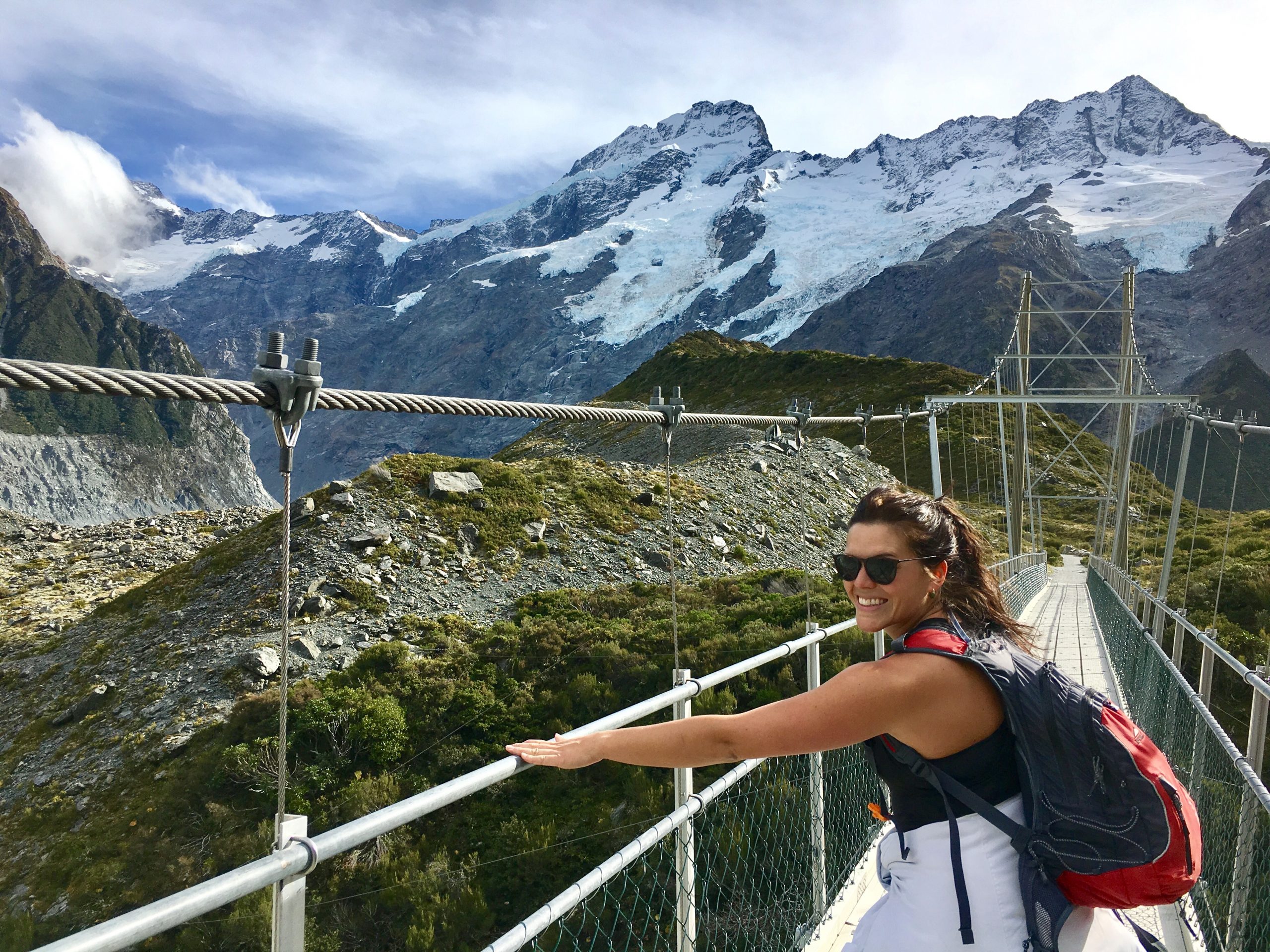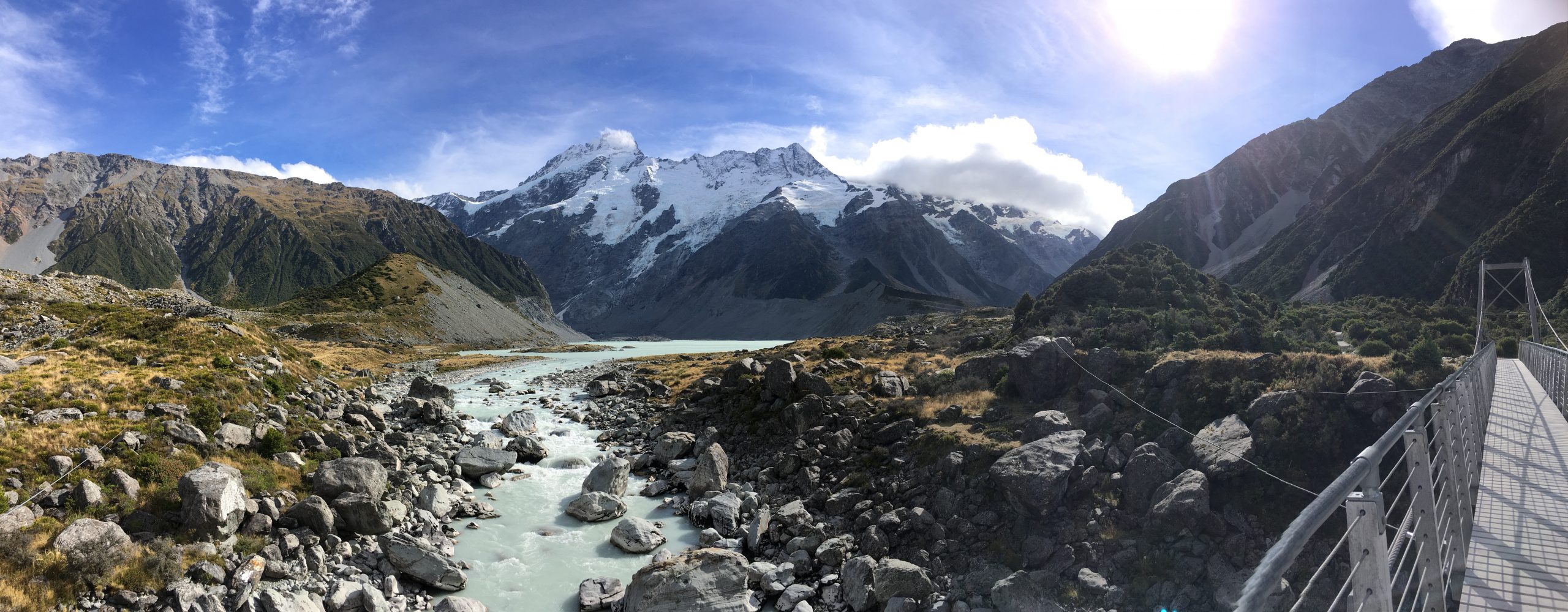 Et c’est reparti pour une marche de 3h AR, direction la « Hooker Valley Track ». C’est une des randonnées les plus prisées car elle offre des points de vue remarquables, et son niveau de difficulté est faible. Un plaisir pour les yeux et les jambes ! Effectivement nous en prenons plein les yeux : des ponts qui se balancent au gré du vent, le bleu très pale résultant de la fonte des glaces, les cascades, les icebergs…