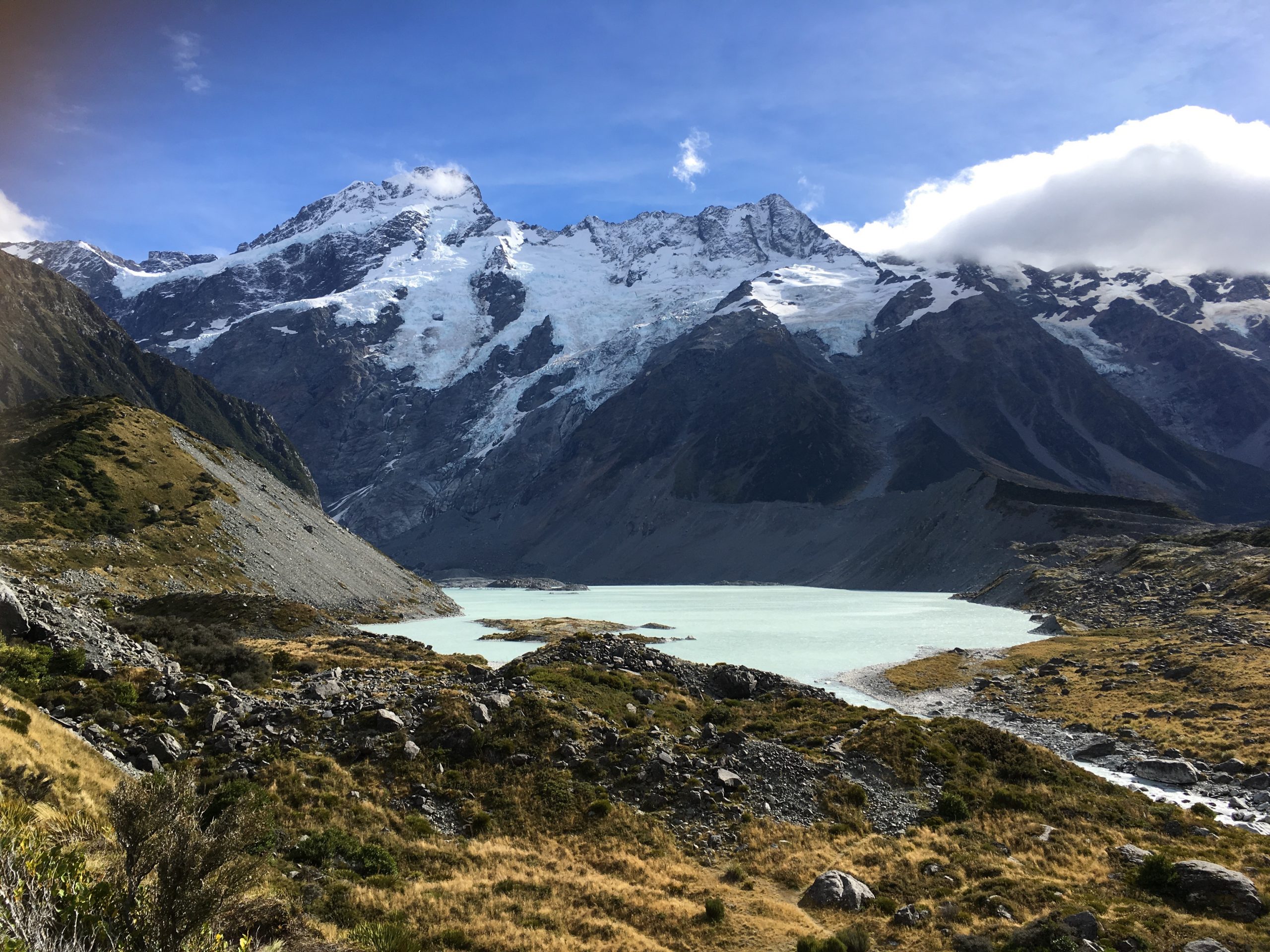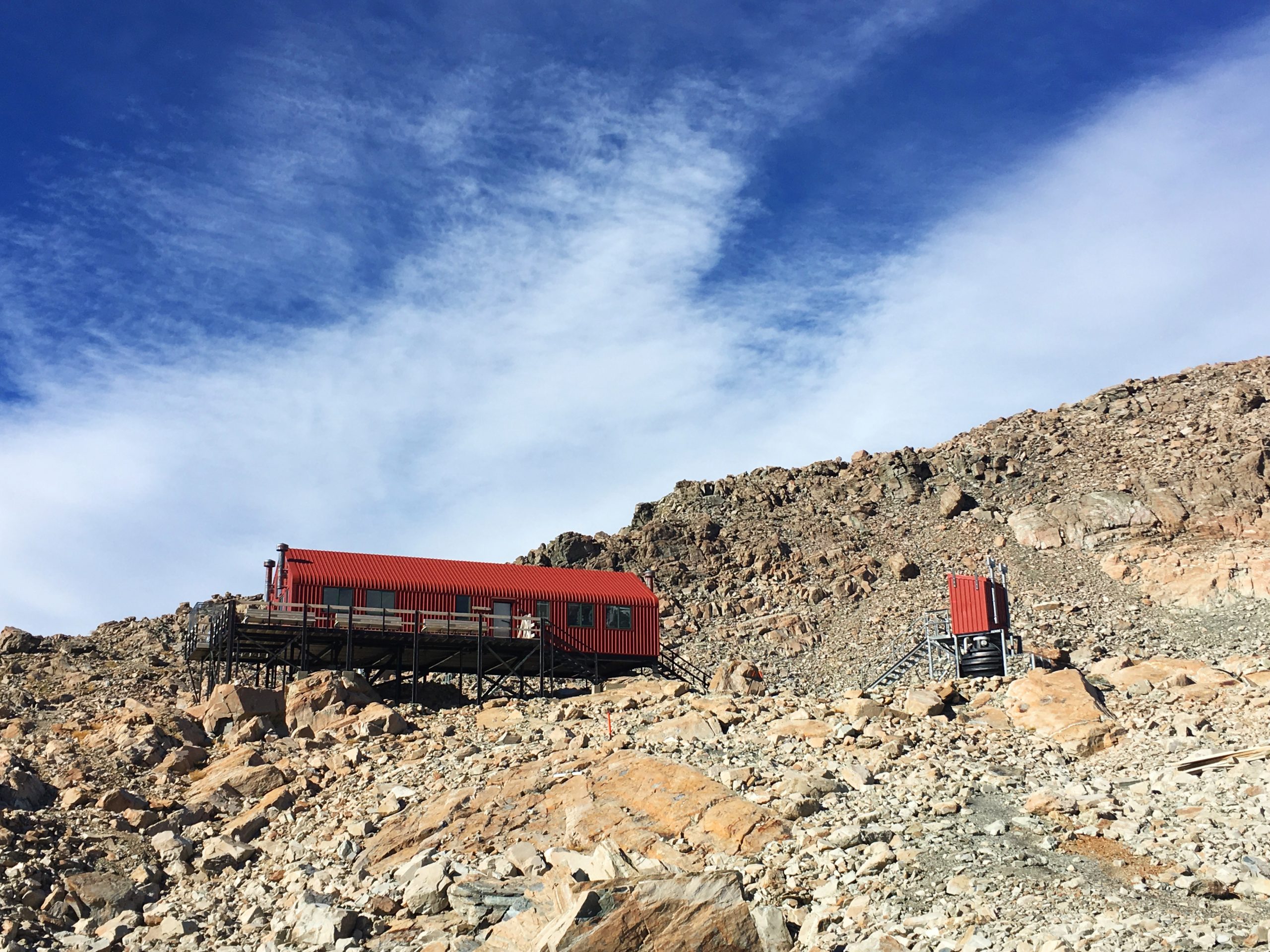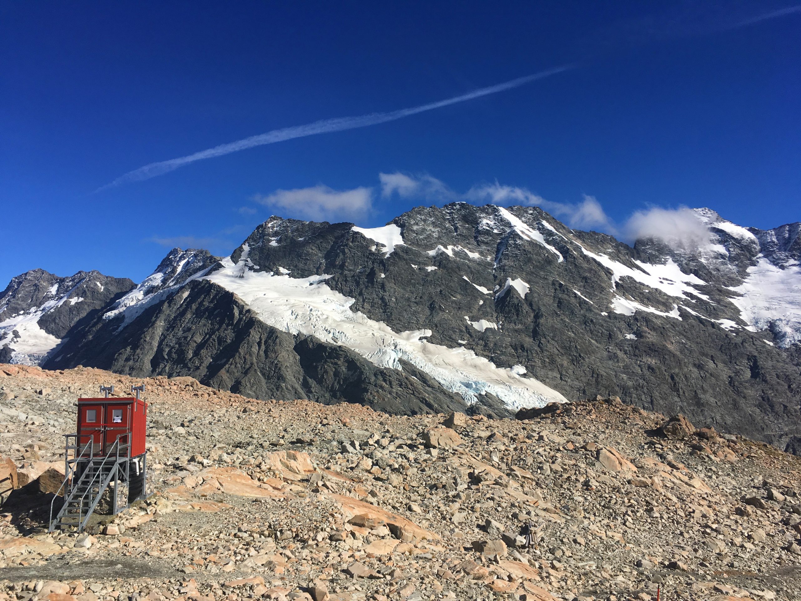 Une fois arrivés à la fin de la première étape (qui correspond à la « Sealy Tarns Track »), nous profitons de la vue et des petits lacs alpins tous mignons. Nous croyons avoir fait le plus dur, mais nous étions bien naïfs. A partir de ce point, le chemin s’efface laissant place à quelques piquets : place à l’escalade ! En effet, c’est un amas de cailloux qu’il faut arpenter. Pour ne pas arranger les choses, nous sommes sortis sans s’en apercevoir du sentier « imaginaire », augmentant ainsi le niveau de difficulté (vous savez le moment où vous vous dîtes, si par malheur je lâche ma prise, je dévale la pente…). Nous atteignons finalement le sommet, et là place au silence. Se retrouver face à ce glacier me laisse bouche bée. Ce point de vue offre un panorama à 360°. Une autre vue s’offre également à moi avec ses lacs aux eaux bleues claires : je suis littéralement envoutée. Nous ne nous attardons pas trop car le vent glacial nous refroidit rapidement. Nous continuons sautant de pierre en pierre tels des chamois : direction la « hut ». Un gite monté sur pilotis, vêtu de rouge (d’ailleurs, j’ai adoré son annexe, à l’extérieur pour la partie douche et toilette). L’endroit idéal pour notre pause déjeuner.