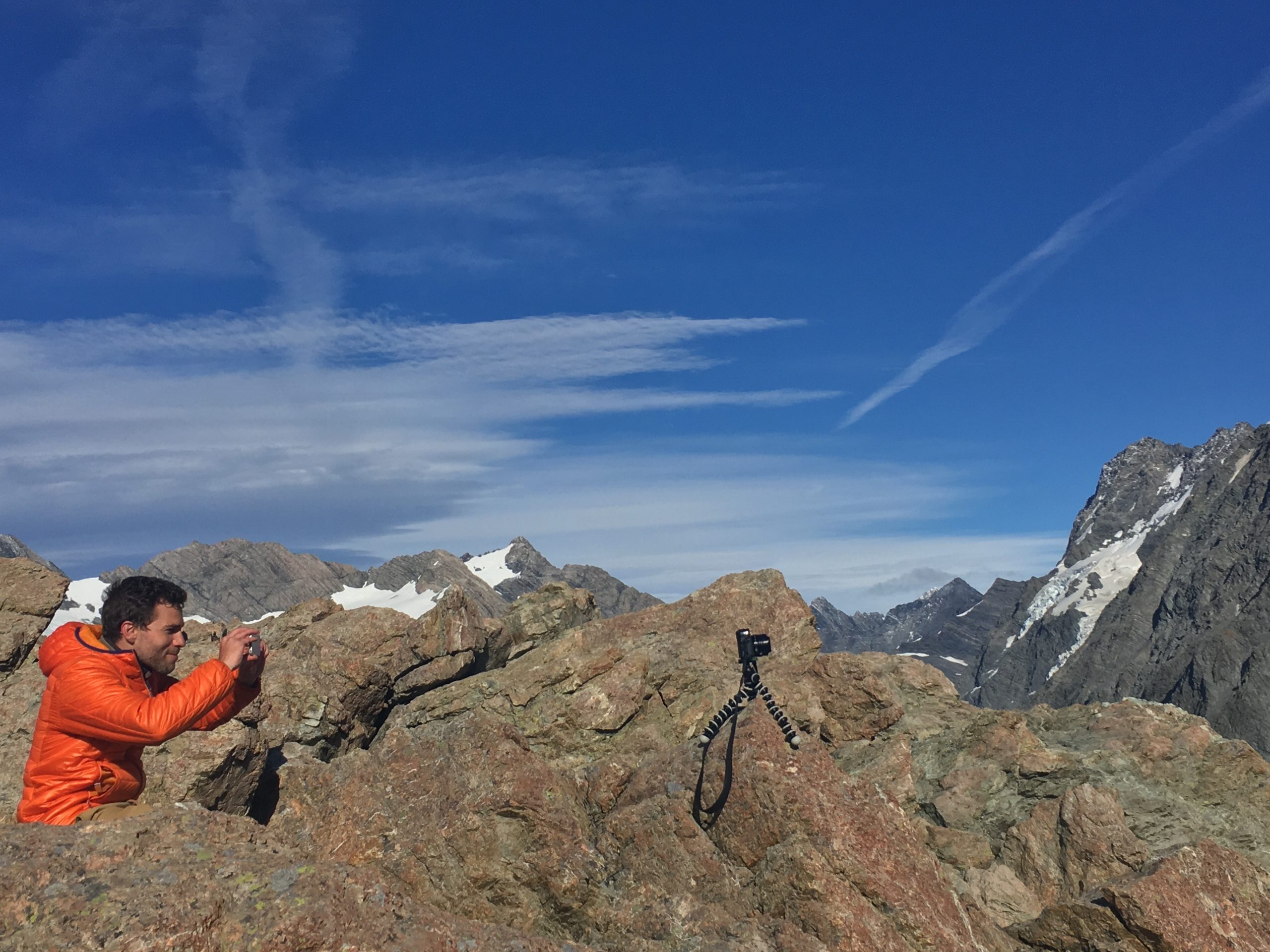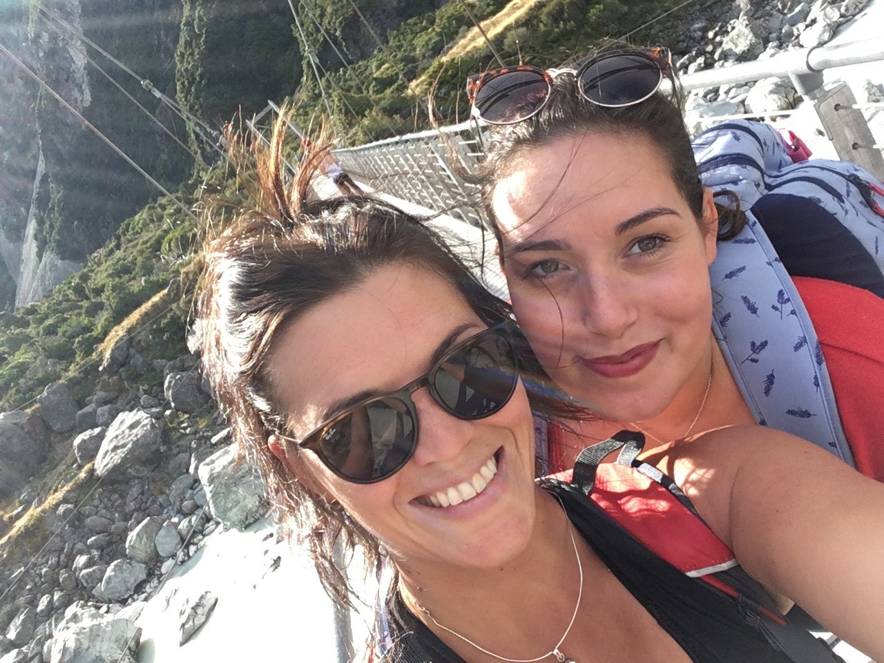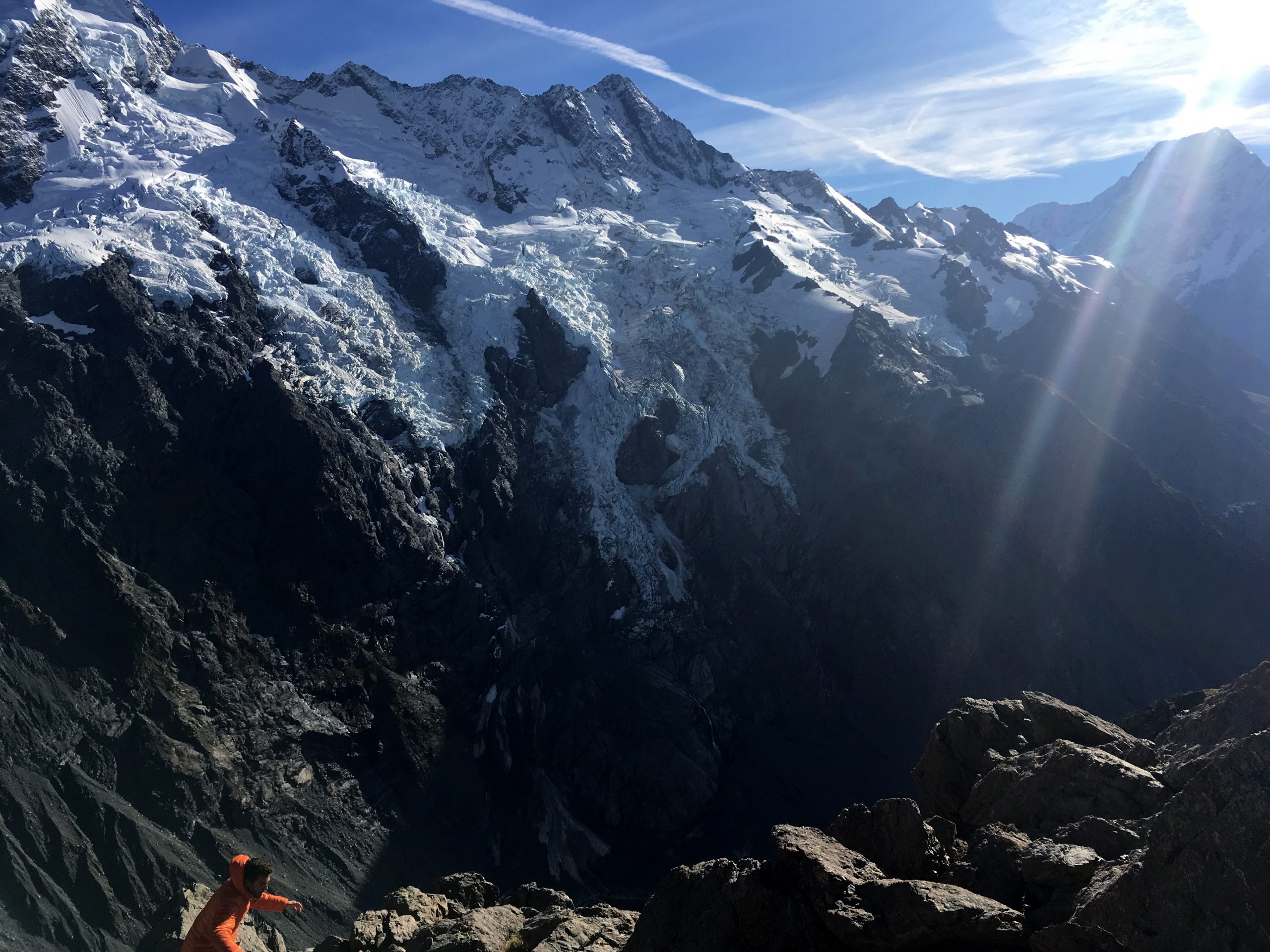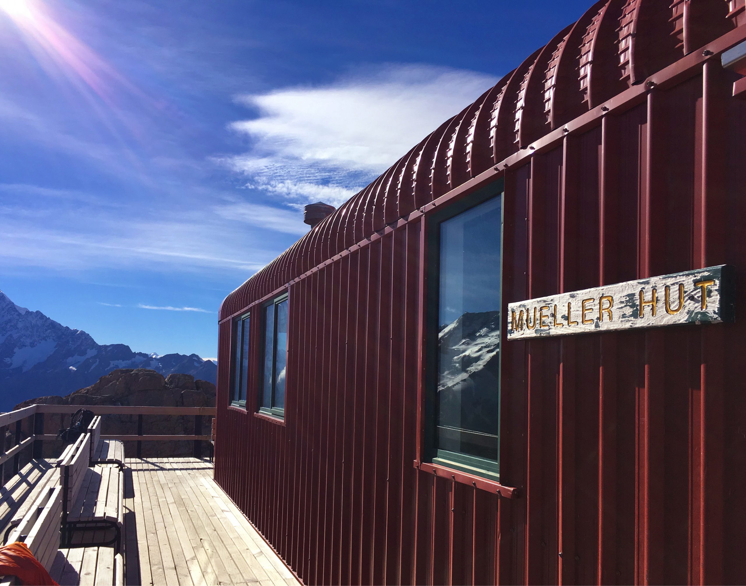 Une fois arrivés à la fin de la première étape (qui correspond à la « Sealy Tarns Track »), nous profitons de la vue et des petits lacs alpins tous mignons. Nous croyons avoir fait le plus dur, mais nous étions bien naïfs. A partir de ce point, le chemin s’efface laissant place à quelques piquets : place à l’escalade ! En effet, c’est un amas de cailloux qu’il faut arpenter. Pour ne pas arranger les choses, nous sommes sortis sans s’en apercevoir du sentier « imaginaire », augmentant ainsi le niveau de difficulté (vous savez le moment où vous vous dîtes, si par malheur je lâche ma prise, je dévale la pente…). Nous atteignons finalement le sommet, et là place au silence. Se retrouver face à ce glacier me laisse bouche bée. Ce point de vue offre un panorama à 360°. Une autre vue s’offre également à moi avec ses lacs aux eaux bleues claires : je suis littéralement envoutée. Nous ne nous attardons pas trop car le vent glacial nous refroidit rapidement. Nous continuons sautant de pierre en pierre tels des chamois : direction la « hut ». Un gite monté sur pilotis, vêtu de rouge (d’ailleurs, j’ai adoré son annexe, à l’extérieur pour la partie douche et toilette). L’endroit idéal pour notre pause déjeuner.