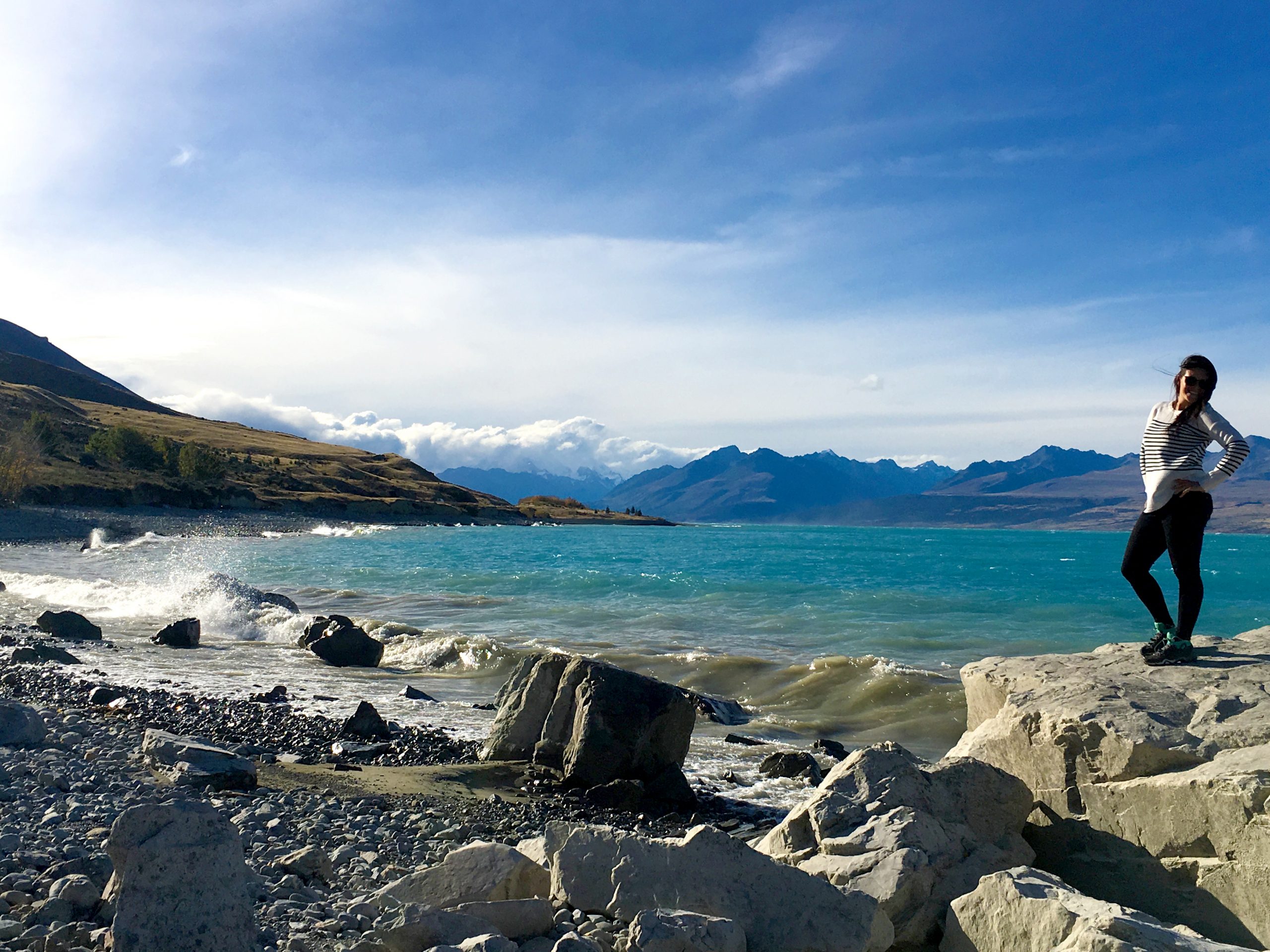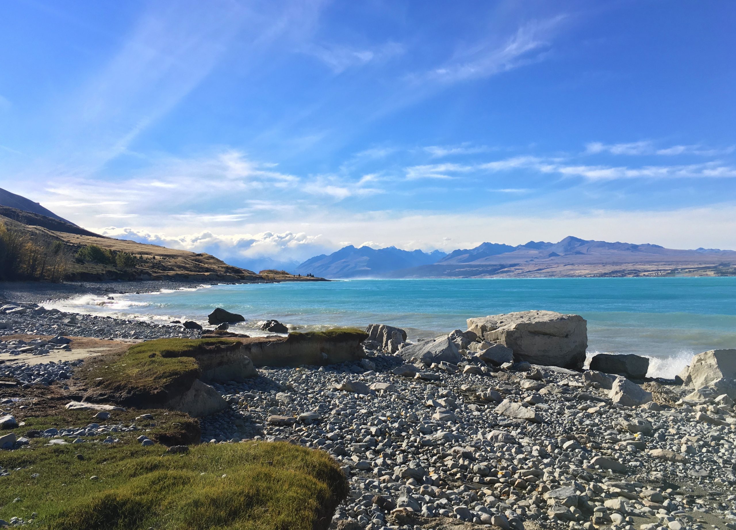 Une route tout simplement sublime ! Nous longeons le lac PUKAKI, qui est magnifique avec sa couleur bleu azur.