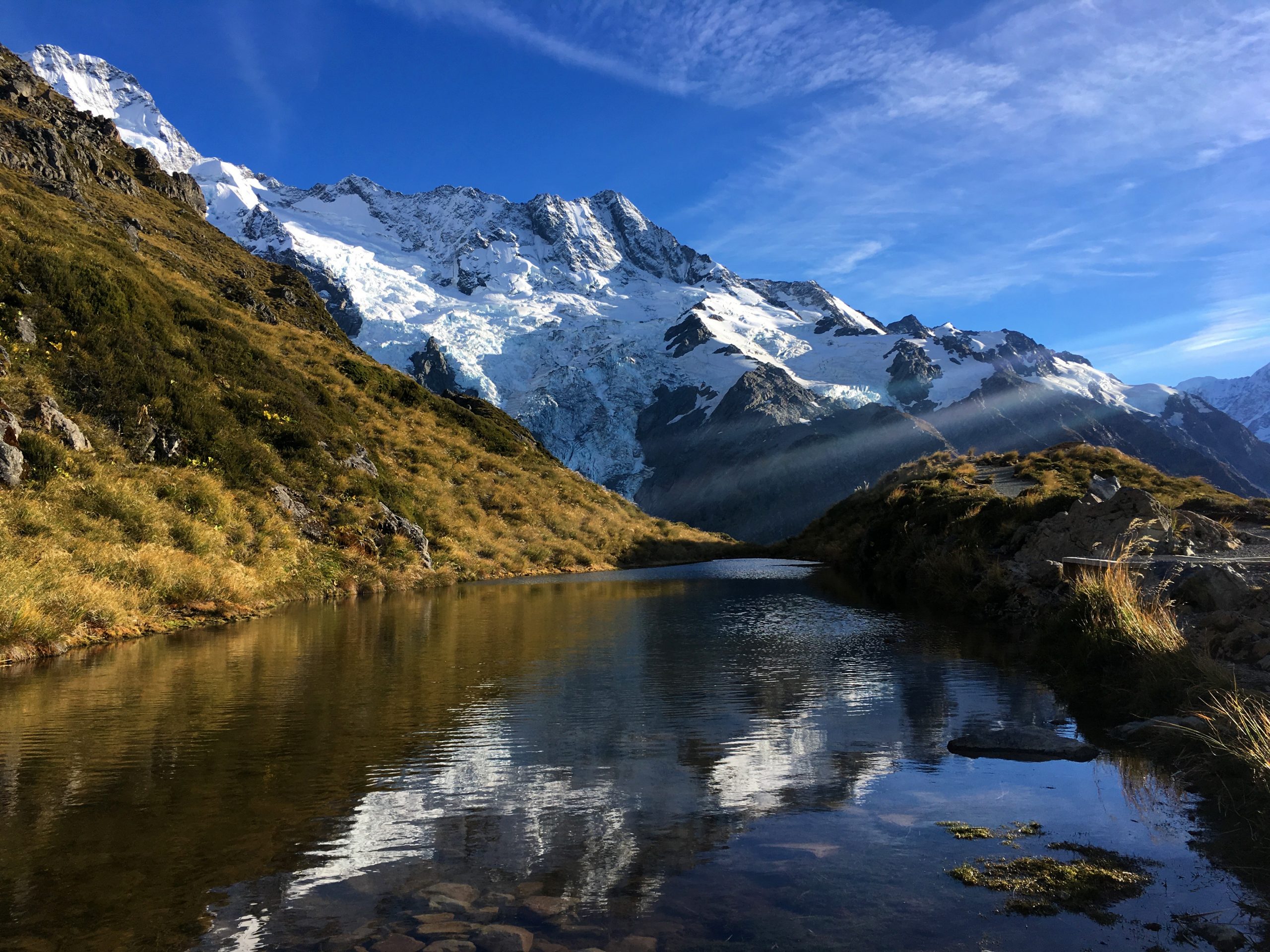 Départ pour aller voir ce fameux Mr cook (Aōraki de son nom maori), la montagne la plus haute non seulement des Alpes du sud mais aussi de Nouvelle Zélande, atteignant ainsi les 3754m!