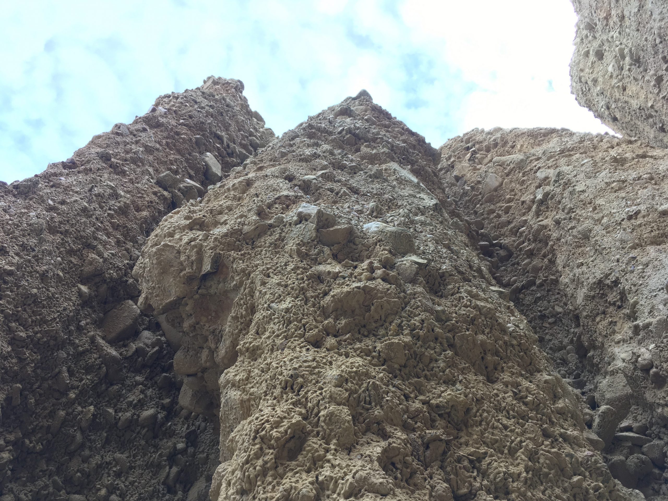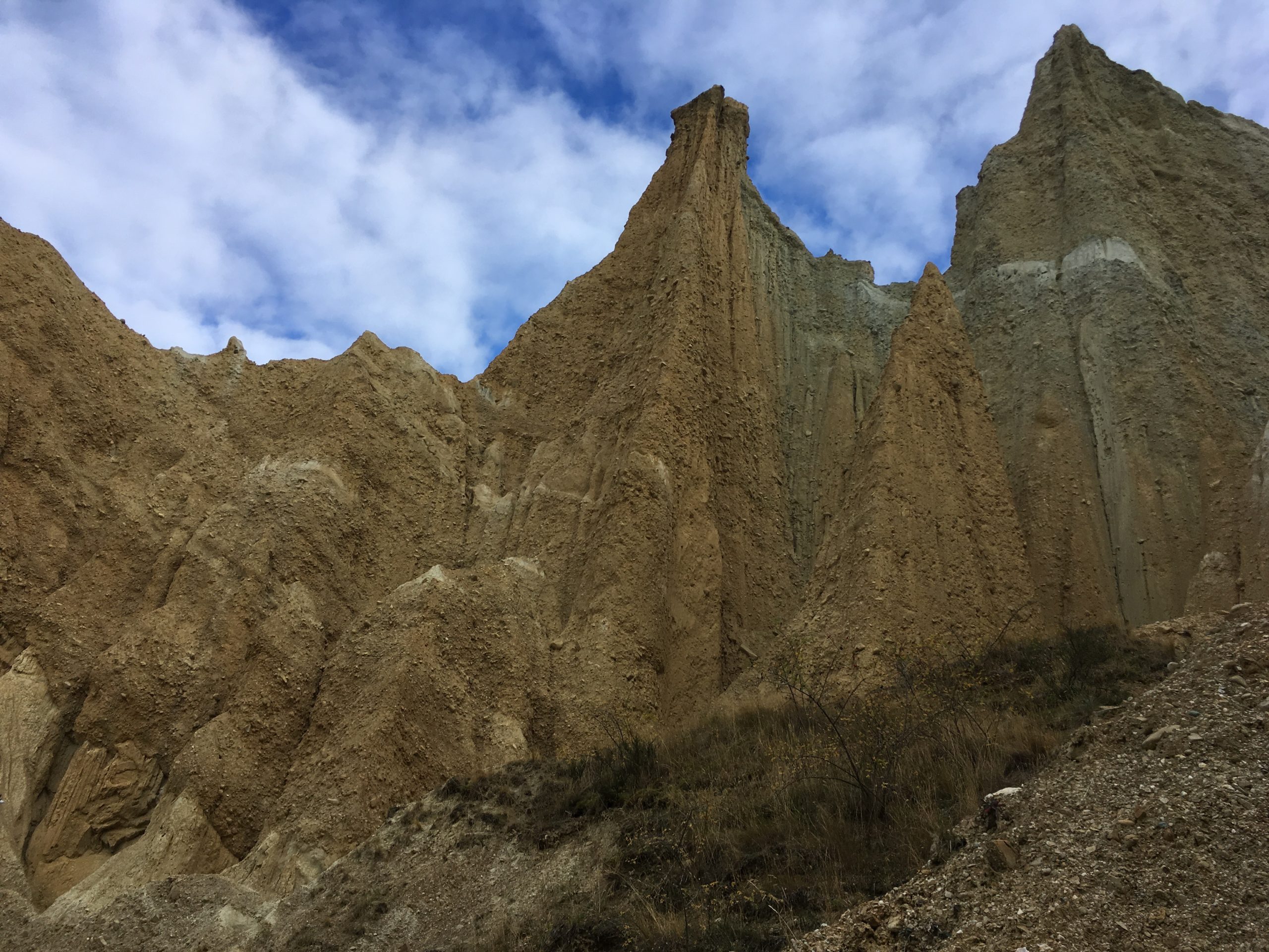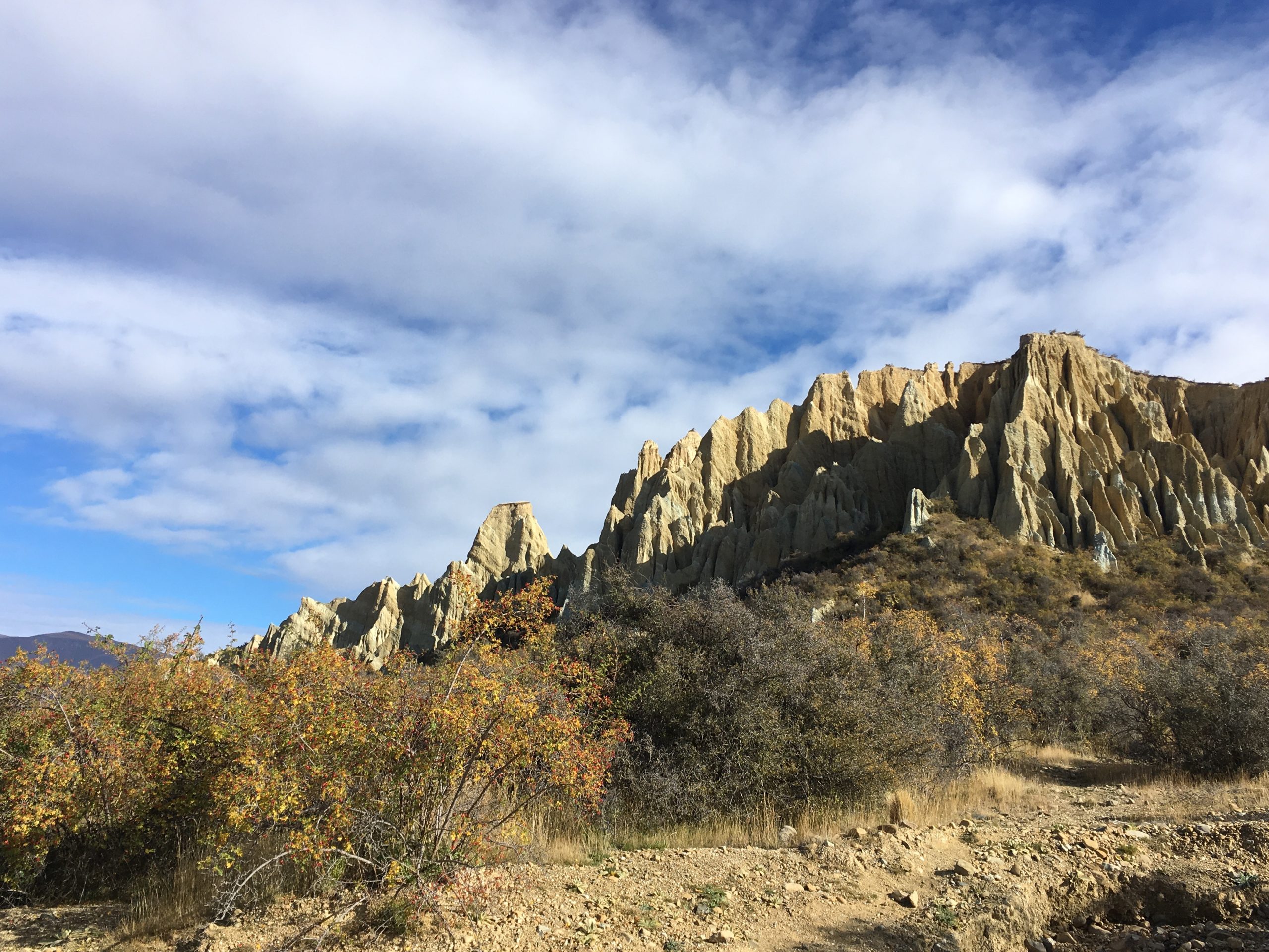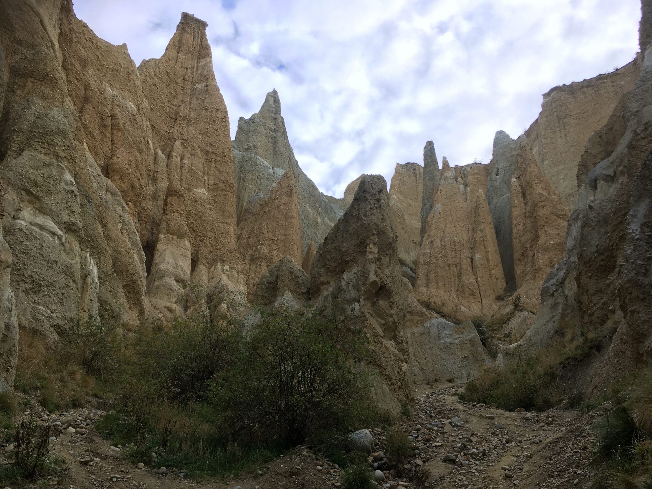 Bref le jour se lève je pars à 10km de là pour voir les Clay Cliffs. Se trouvant sur un site privé il faut laisser 5$ dans une petite boite à l’entrée. Il s’agit de roches qui pointent vers le ciel. Sa roche friable à la couleur jaune, ressemble plus aux paysages que l’on pourrait voir aux Etats Unis. Se retrouver au milieu de ses gigantesques amas de roches est très impressionnant : je me sens toute petite. Je lève la tête et admire chaque formation, essayant parfois de deviner une forme, un dessin…D’ailleurs même si la couleur dominante est le jaune/orangé, l’on retrouve un cumul de roches violettes, vertes et blanches.
