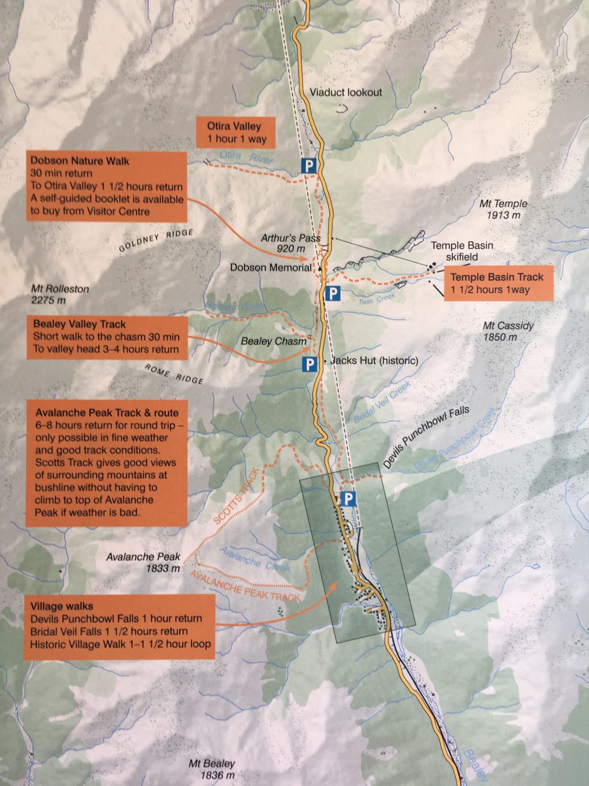 J’arrive enfin à ARTHUR PASS en début d’après midi. Comme d’habitude je me rends à l’office de tourisme pour connaître les prévisions météorologiques et les randonnées dans les environs. J’opte pour une petite randonnée de 3h, non loin de là : « Temple Bassin ». Je la boucle en 2h et pour être franche elle ne m’a pas vraiment plu.