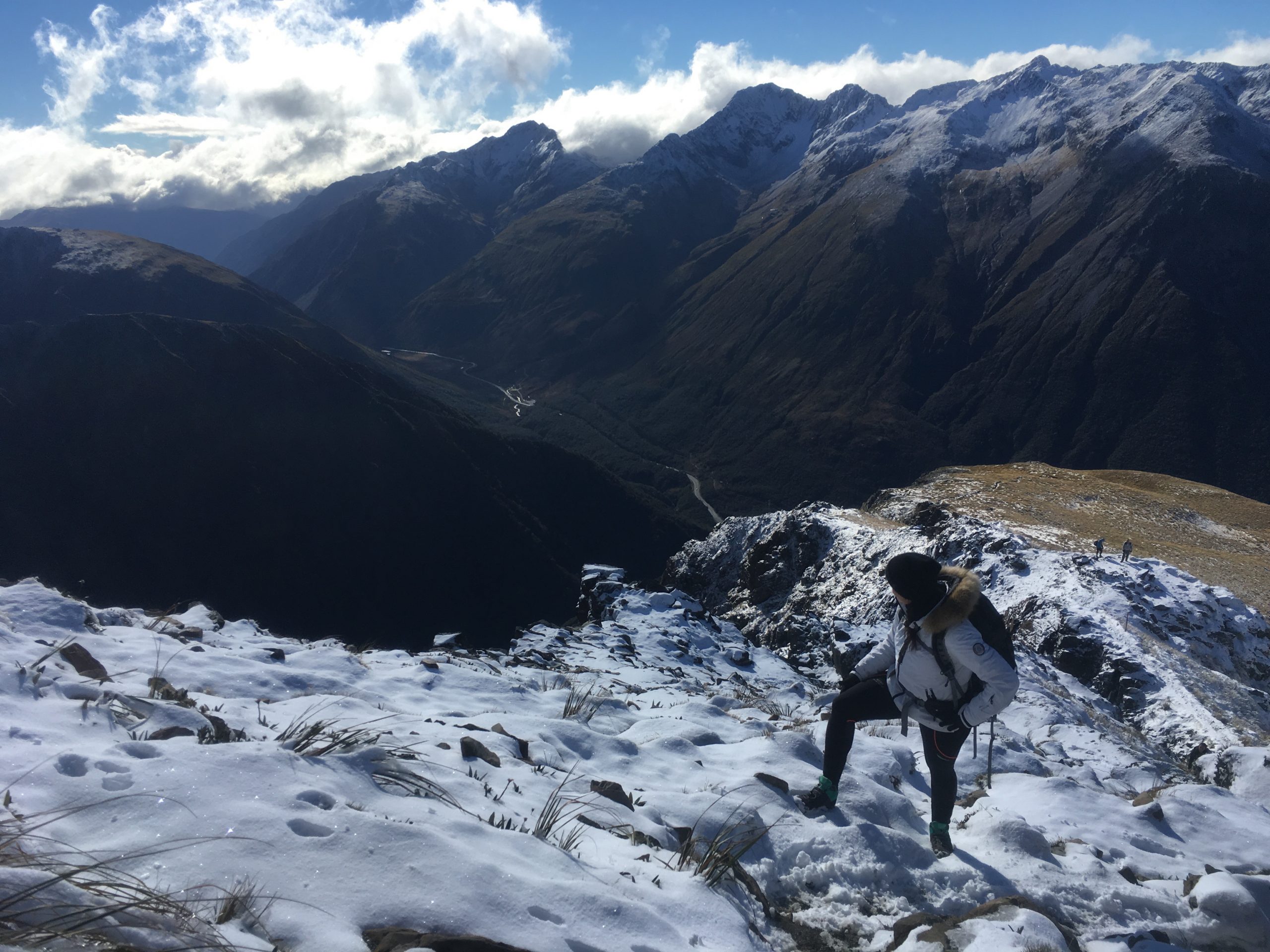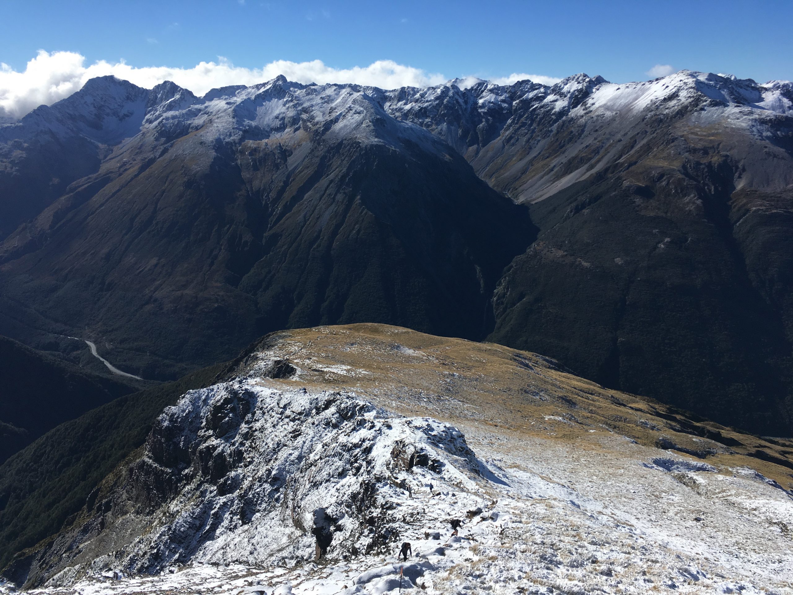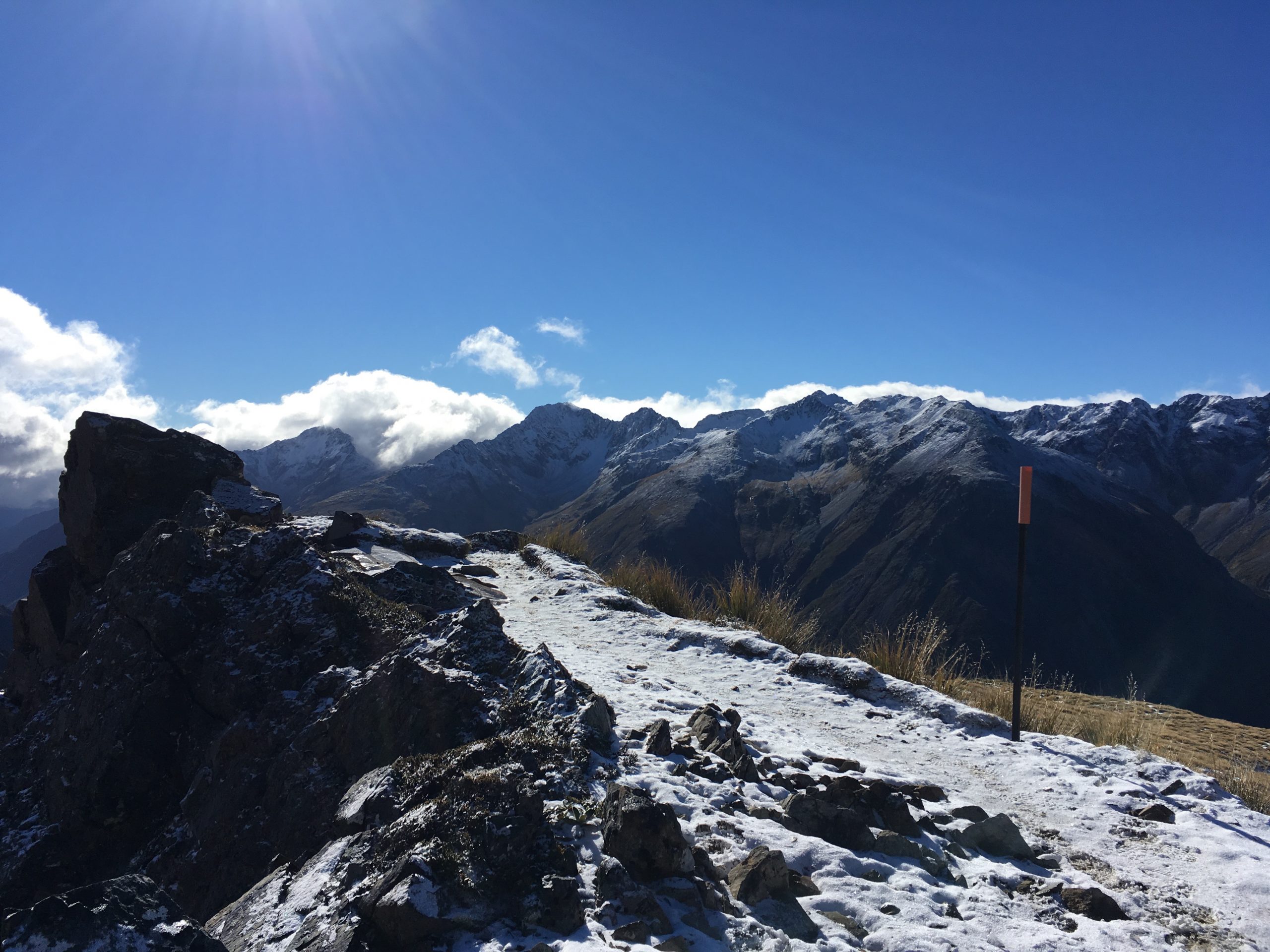 Bon, j’en suis revenue vivante, quoique un petit peu congelée, une température à environ -5°, un vent pas loin des 60 km, le tout sous la neige. Ah les sommets enneigés, c’est beau ! mais pas évident à grimper. Je me suis finalement arrêtée quelques mètres avant le sommet. La fin du parcours, avec la neige s’avérait beaucoup trop dangereux, avec un passage sur arête. Etant donné la puissance du vent, j’ai préféré rester en vie ! Je finis donc cette randonnée en 5h50. Même si je l’ai trouvé assez difficile compte tenu de la neige. Elle ne m’a pas cassé les jambes comme celle du Mount Cook, toujours indétrônable !