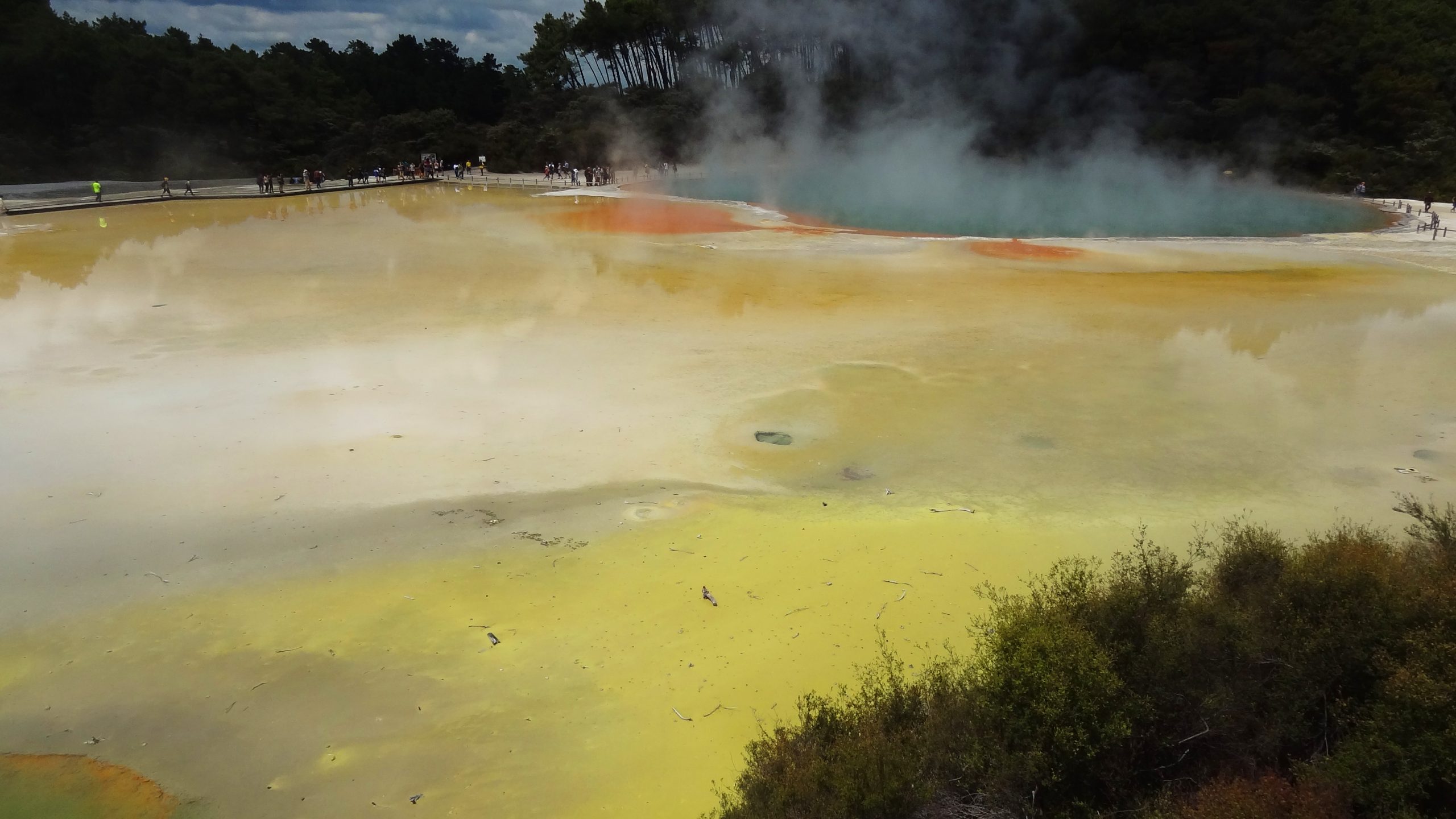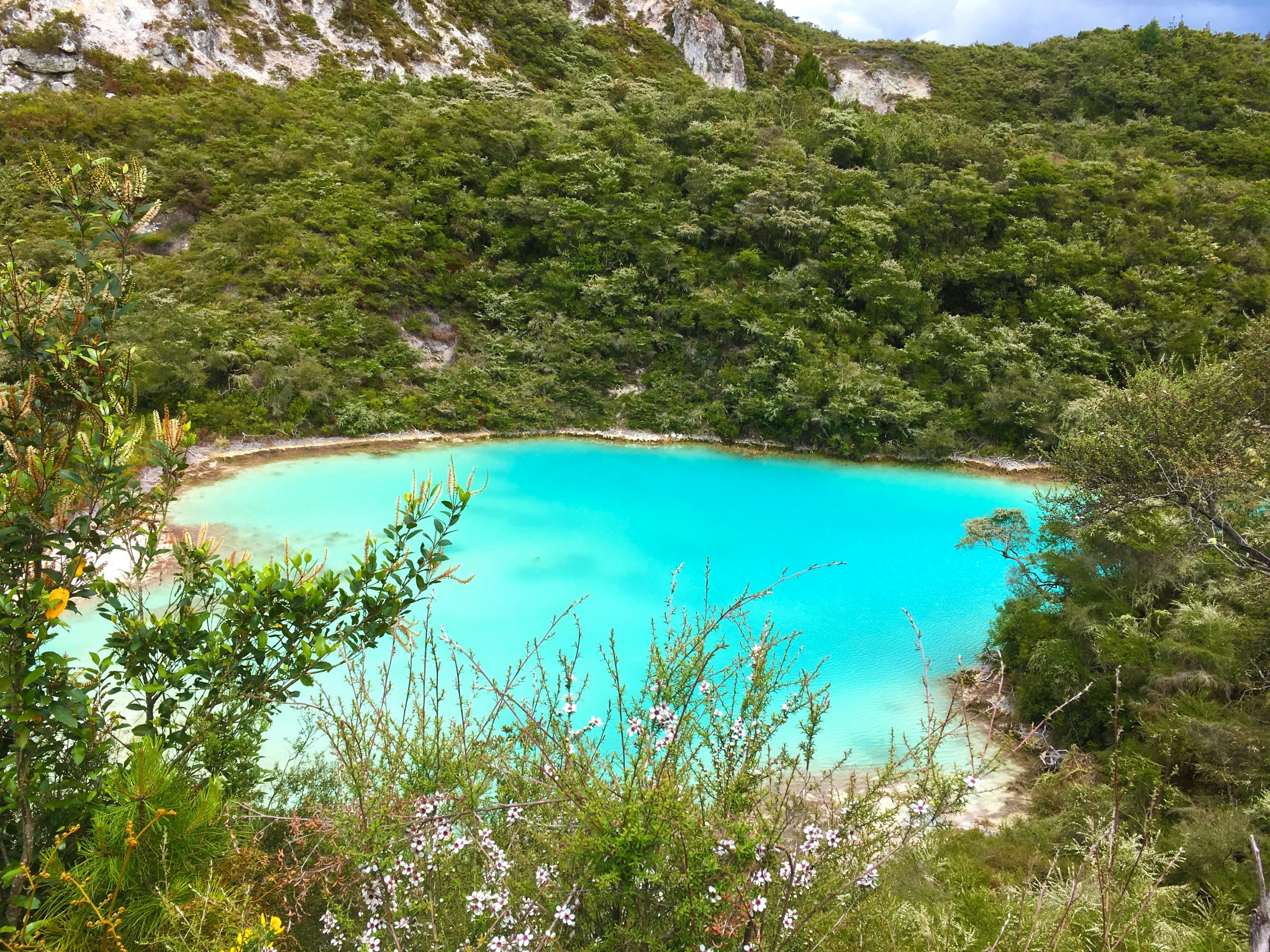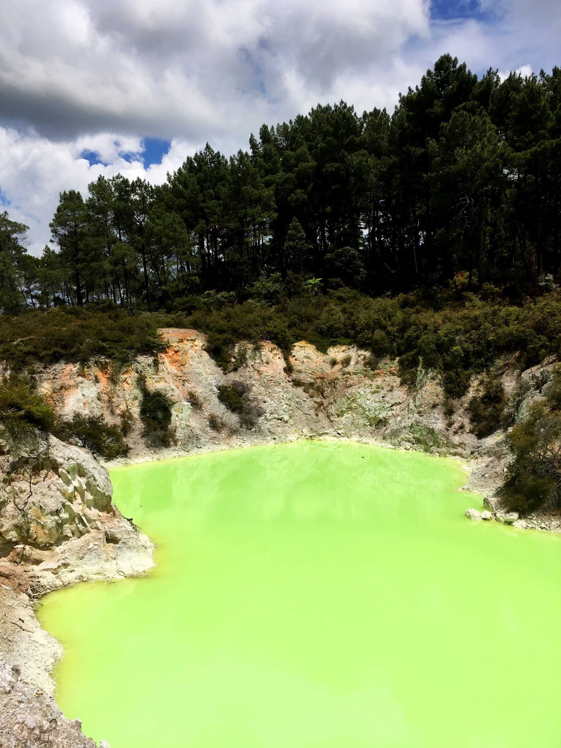 Rotorua, une ville riche par son activité volcanique et géothermique. En partant se promener, il n’est pas étonnant de se retrouver face à une montagne qui fume, croiser un lac d’un bleu turquoise, si pur que l’on se croirait dans une sorte de monde parallèle ! D’ailleurs, au passage, même si cette couleur est un appel à la baignade, il ne vaut mieux pas tenter le coup – à moins que vous souhaitiez ressortir brûlés.Tant de découvertes qui pour moi sont nouvelles, d’où mon émerveillement à chaque instant…Bon je ne vous cache pas que je me suis fait cette reflexion : « attends un peu… la ville est construite sur un ancien cratère de volcan. Euh… le fait que ça fume, ça bouillonne de tous les côtés, tu es sûre que ça craint rien, que l’on ne va exploser comme un bouchon de champagne ? »