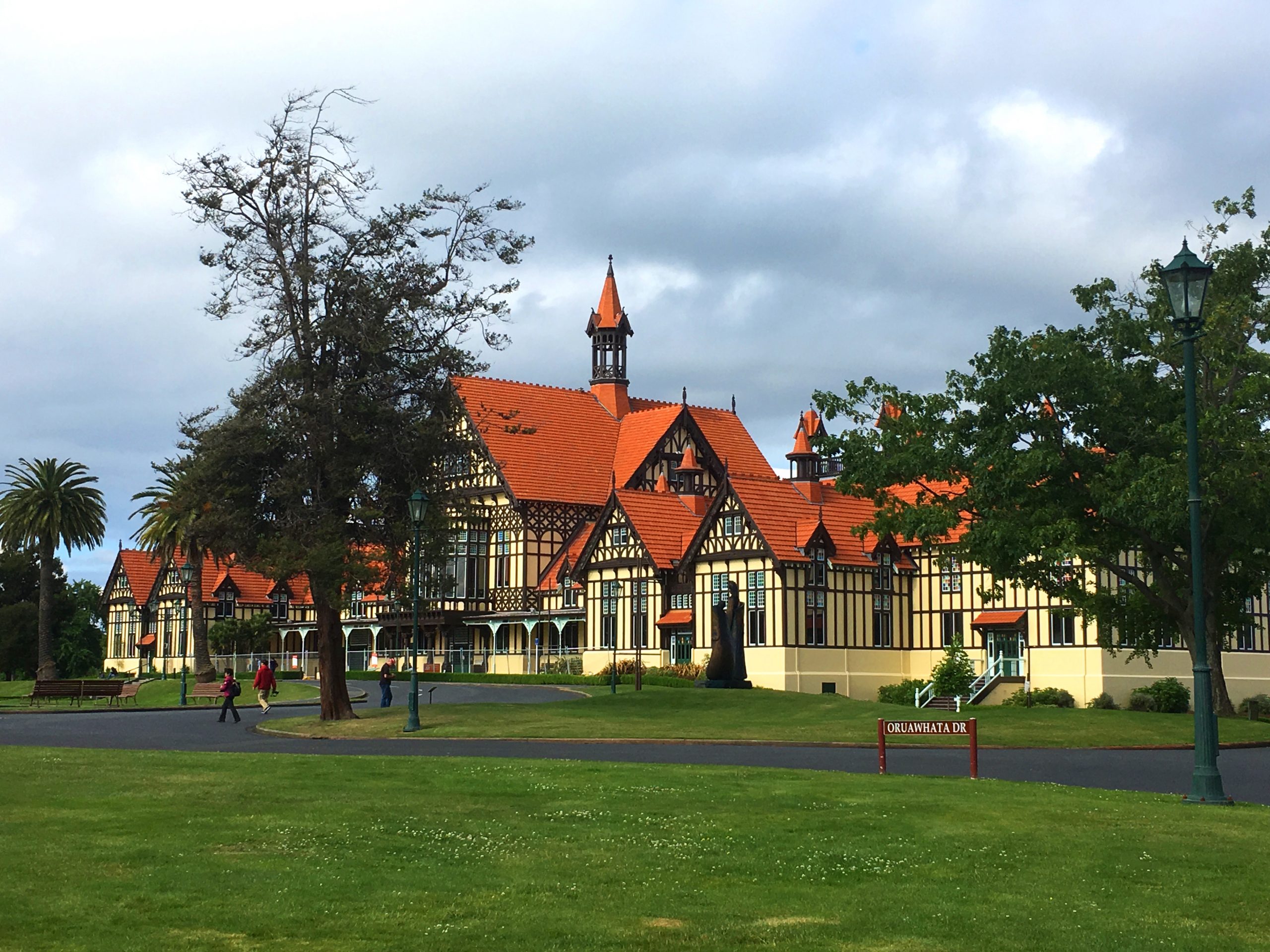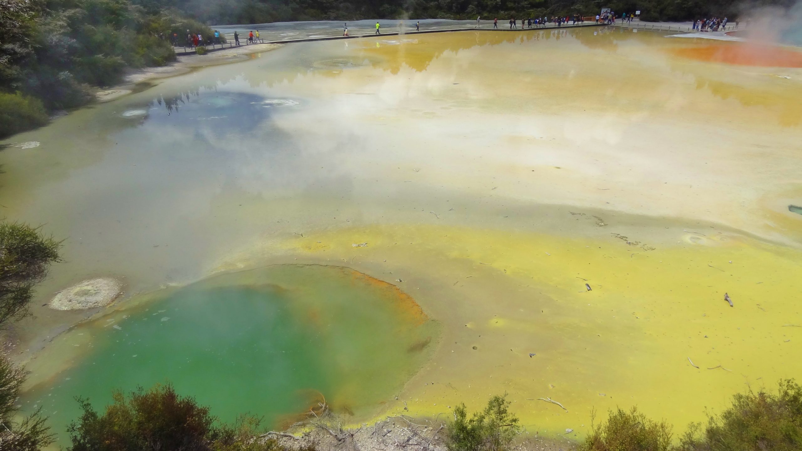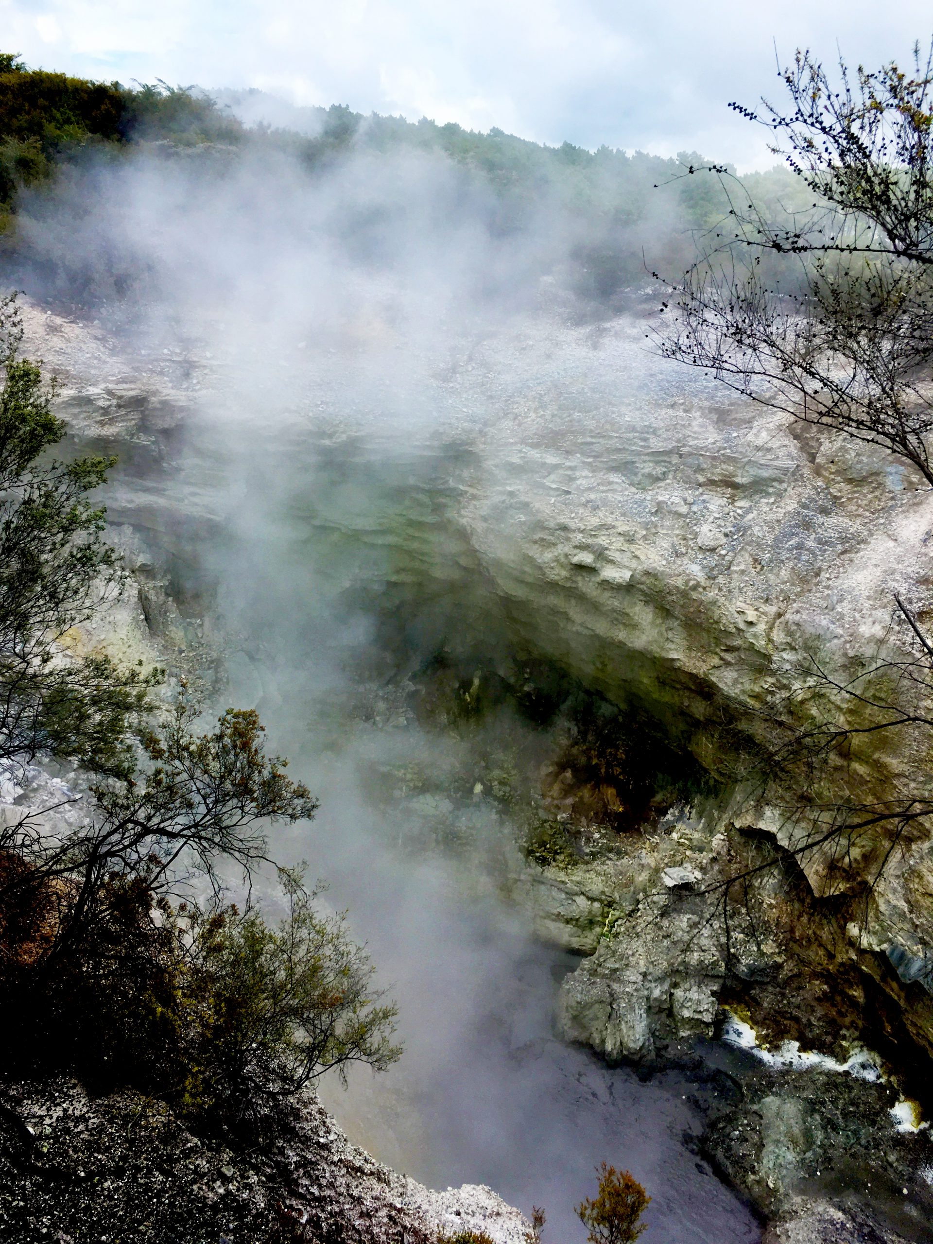 Rotorua, une ville riche par son activité volcanique et géothermique. En partant se promener, il n’est pas étonnant de se retrouver face à une montagne qui fume, croiser un lac d’un bleu turquoise, si pur que l’on se croirait dans une sorte de monde parallèle ! D’ailleurs, au passage, même si cette couleur est un appel à la baignade, il ne vaut mieux pas tenter le coup – à moins que vous souhaitiez ressortir brûlés.Tant de découvertes qui pour moi sont nouvelles, d’où mon émerveillement à chaque instant…Bon je ne vous cache pas que je me suis fait cette reflexion : « attends un peu… la ville est construite sur un ancien cratère de volcan. Euh… le fait que ça fume, ça bouillonne de tous les côtés, tu es sûre que ça craint rien, que l’on ne va exploser comme un bouchon de champagne ? »