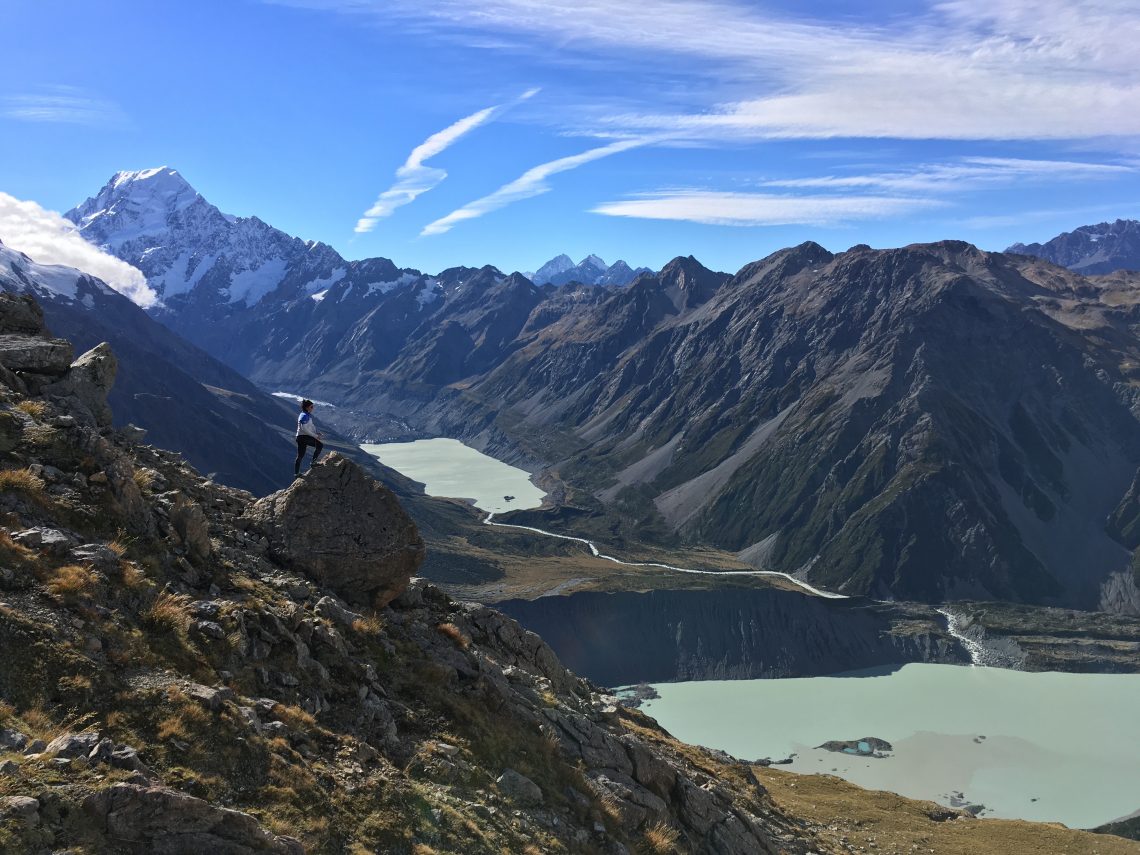 83 km parcourusDépart pour aller voir ce fameux Mr cook (Aōraki de son nom maori), la montagne la plus haute non seulement des Alpes du sud mais aussi de Nouvelle Zélande, atteignant ainsi les 3754m!Une route tout simplement sublime ! Nous longeons le lac PUKAKI, qui est magnifique avec sa couleur bleu azur.Lisa l’a même honorée comme il se doit en faisant quelques brasses (je précise que nous rentrons dans l’hiver, sa température aussi…). Quelques photos « collector », puis nous reprenons la route. Plus nous nous approchons du Mont Cook, plus je sais déjà que cet endroit va me plaire !Et c’est reparti pour une marche de 3h AR, direction…