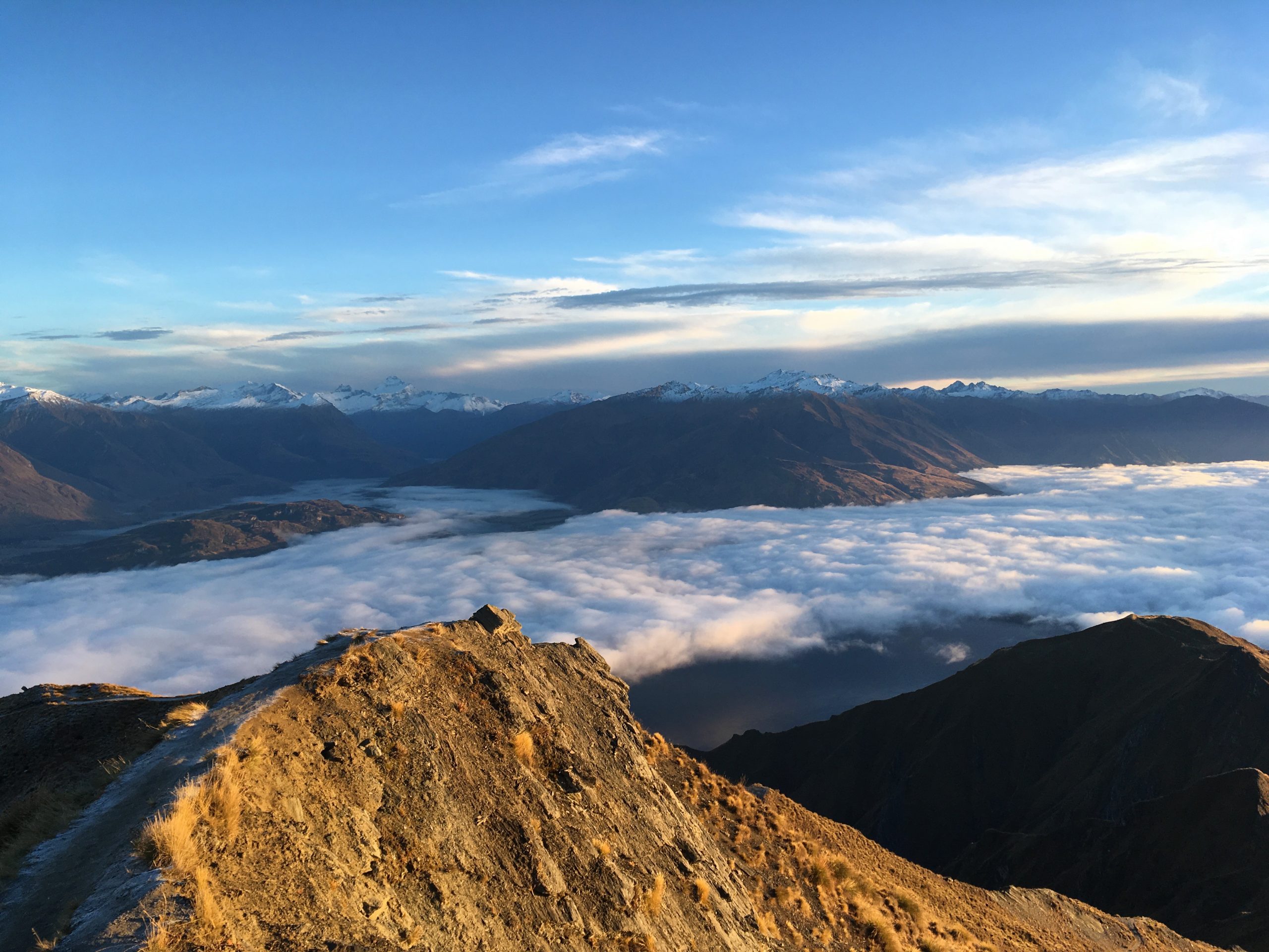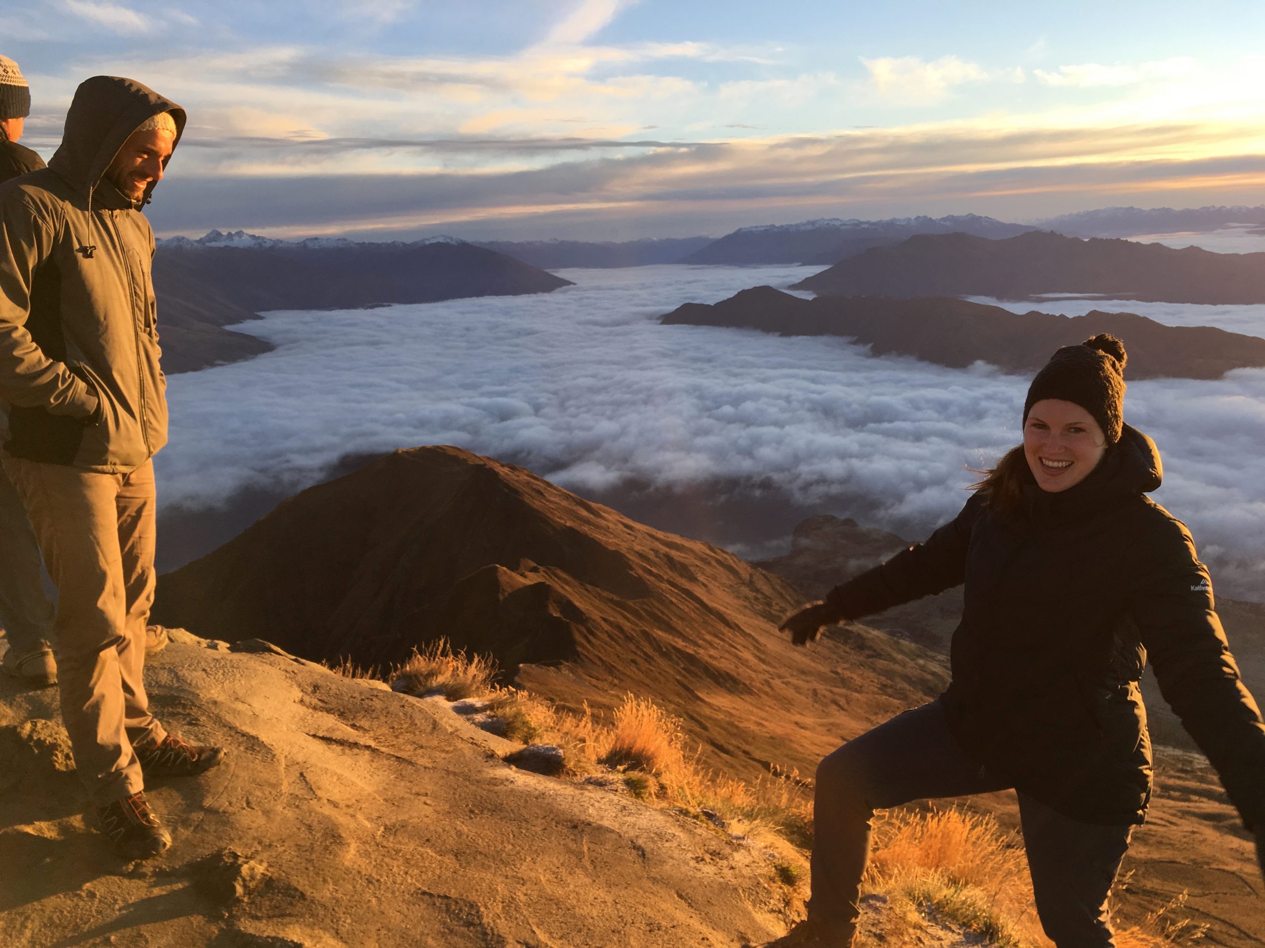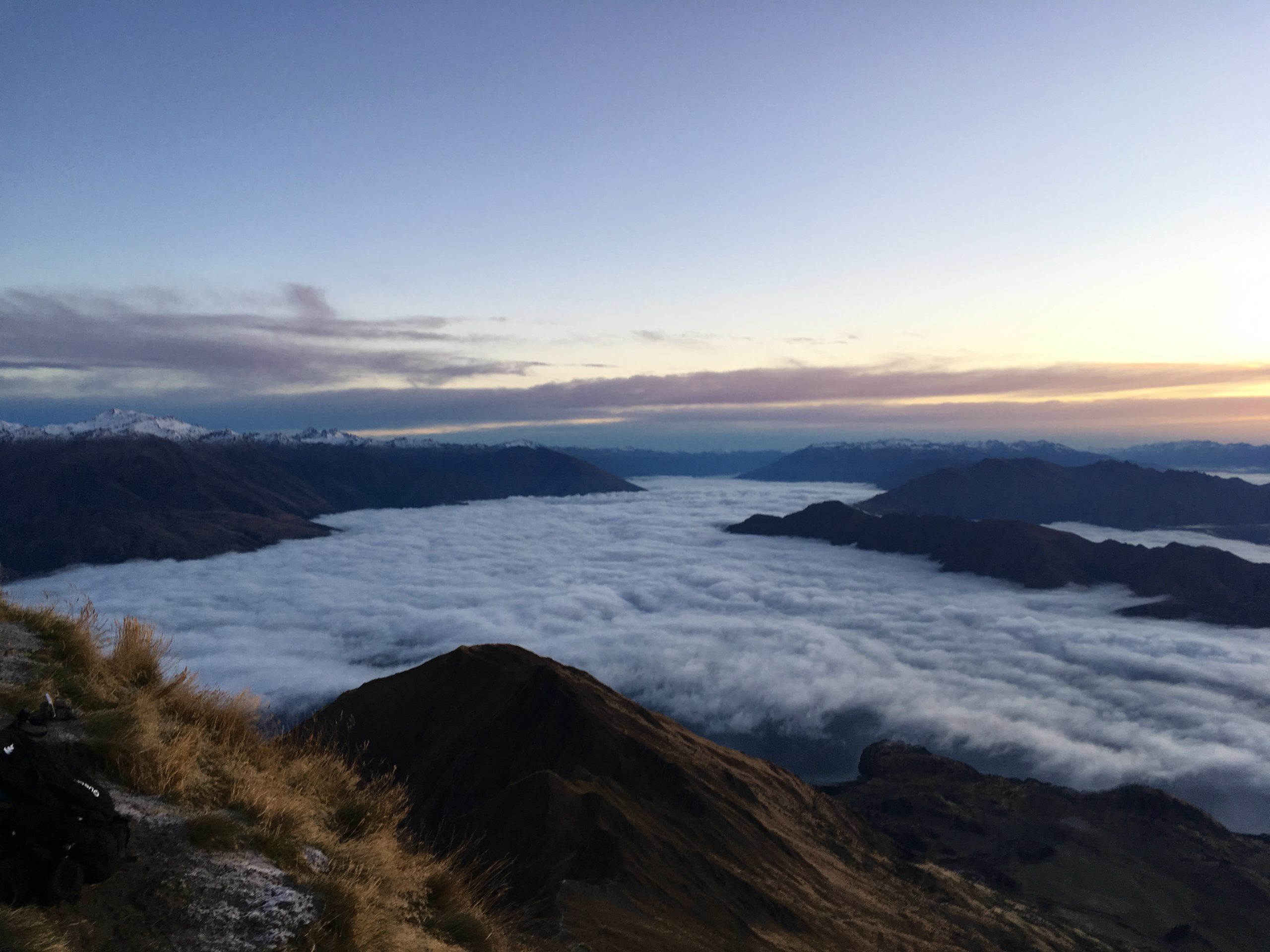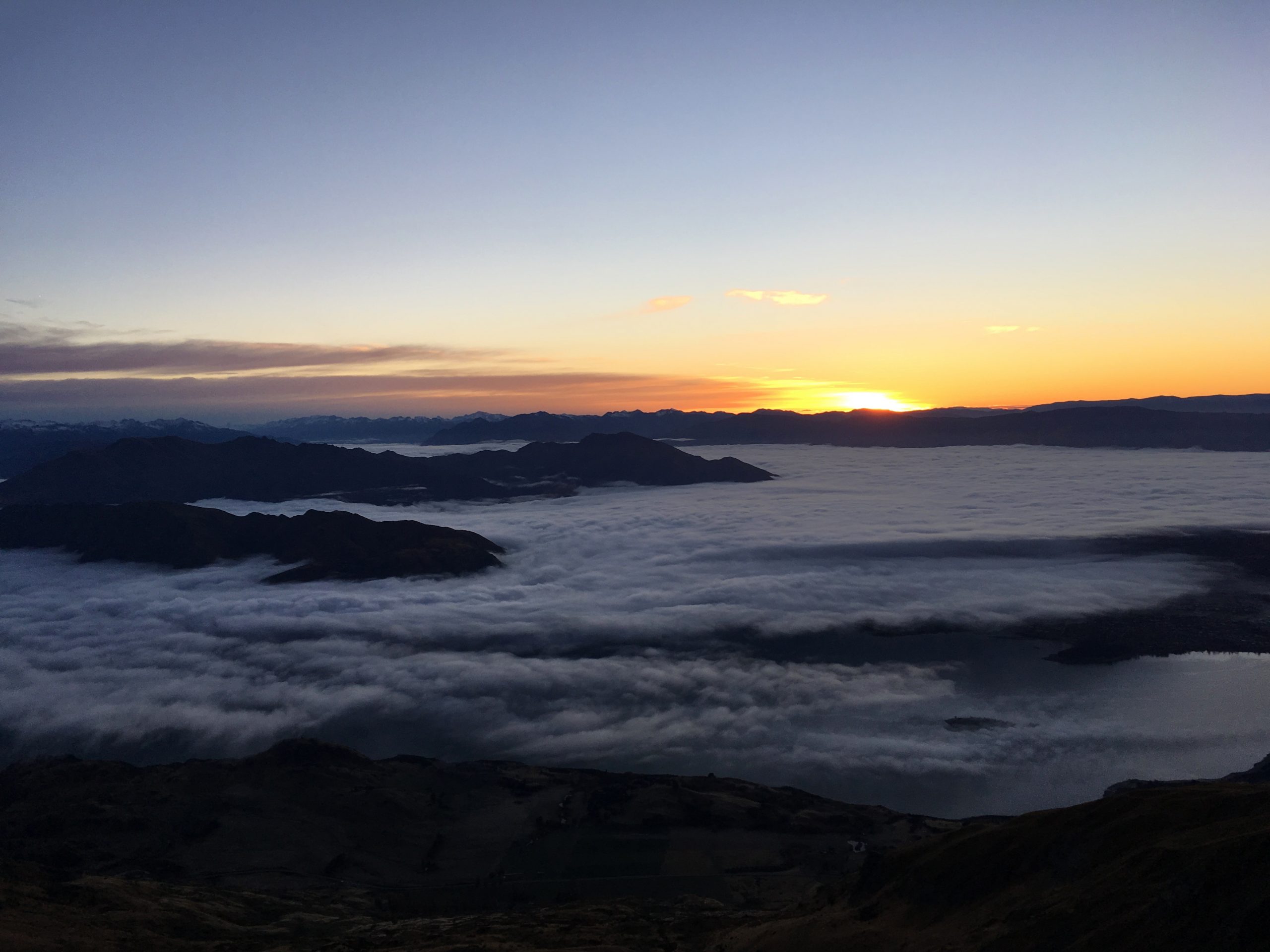 Lendemain matin, réveil à 3h30 du matin. Je pars pour une randonnée de nuit avec Valentin rencontré dans mon auberge la veille. A peu près réveillés, lampe torche sur le front, nous voici partis pour 2h30 d’ascension, direction « Roys Peak ». La marche en soit n’est pas du tout compliquée, il s’agit de sentier large, sans difficultés majeures. Cependant la constante montée et mes jambes fatiguées des dernières randonnées, ont rendu cette montée difficile. J’arrive donc au sommet avant le lever du soleil comme prévu. Peu de temps après, David et Karina nous rejoignent. On allume le réchaud ! je crois que cela faisait longtemps que je n’avais pas autant apprécié une boisson chaude ! Avec le vent, la température ressentie devait se rapprocher des -7/-10 degrés. Le spectacle est tout simplement magique. Un lever de soleil au dessus de la mer de nuage, une bonne équipe, quoi demander de mieux ?