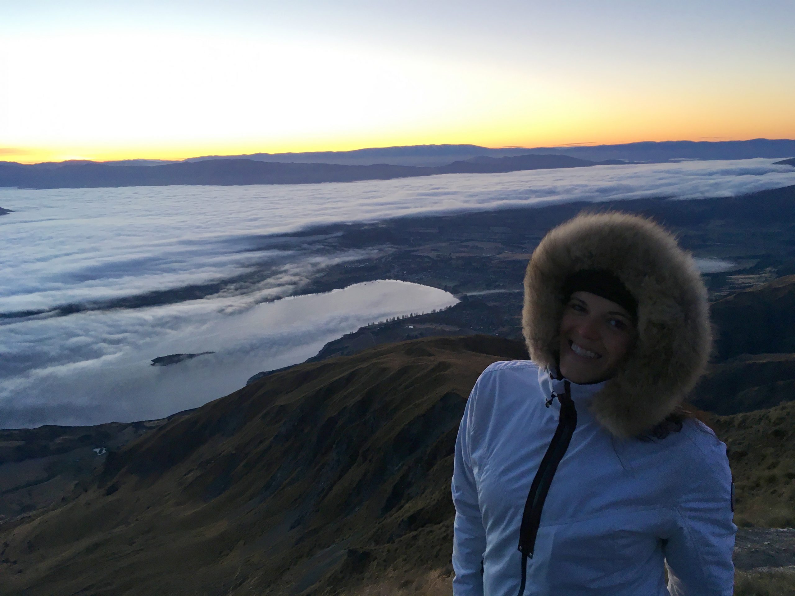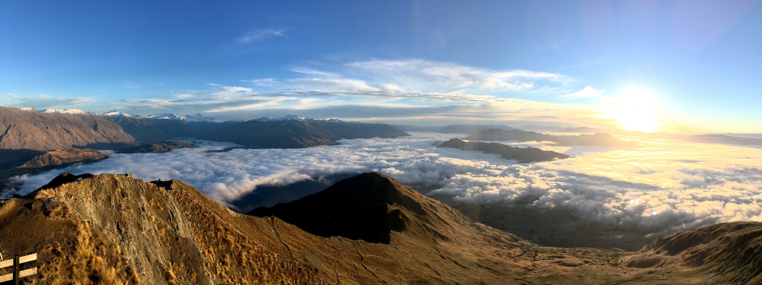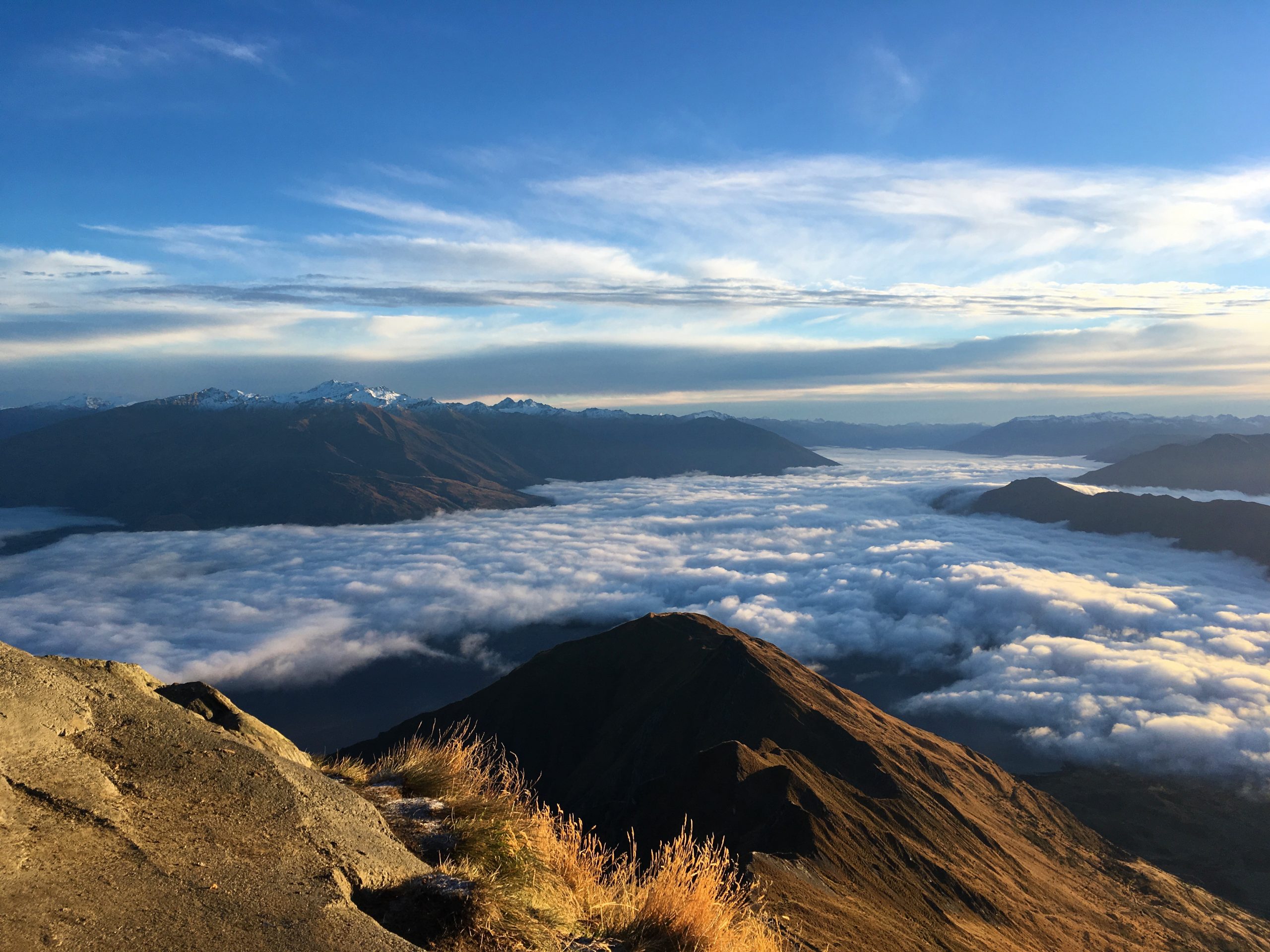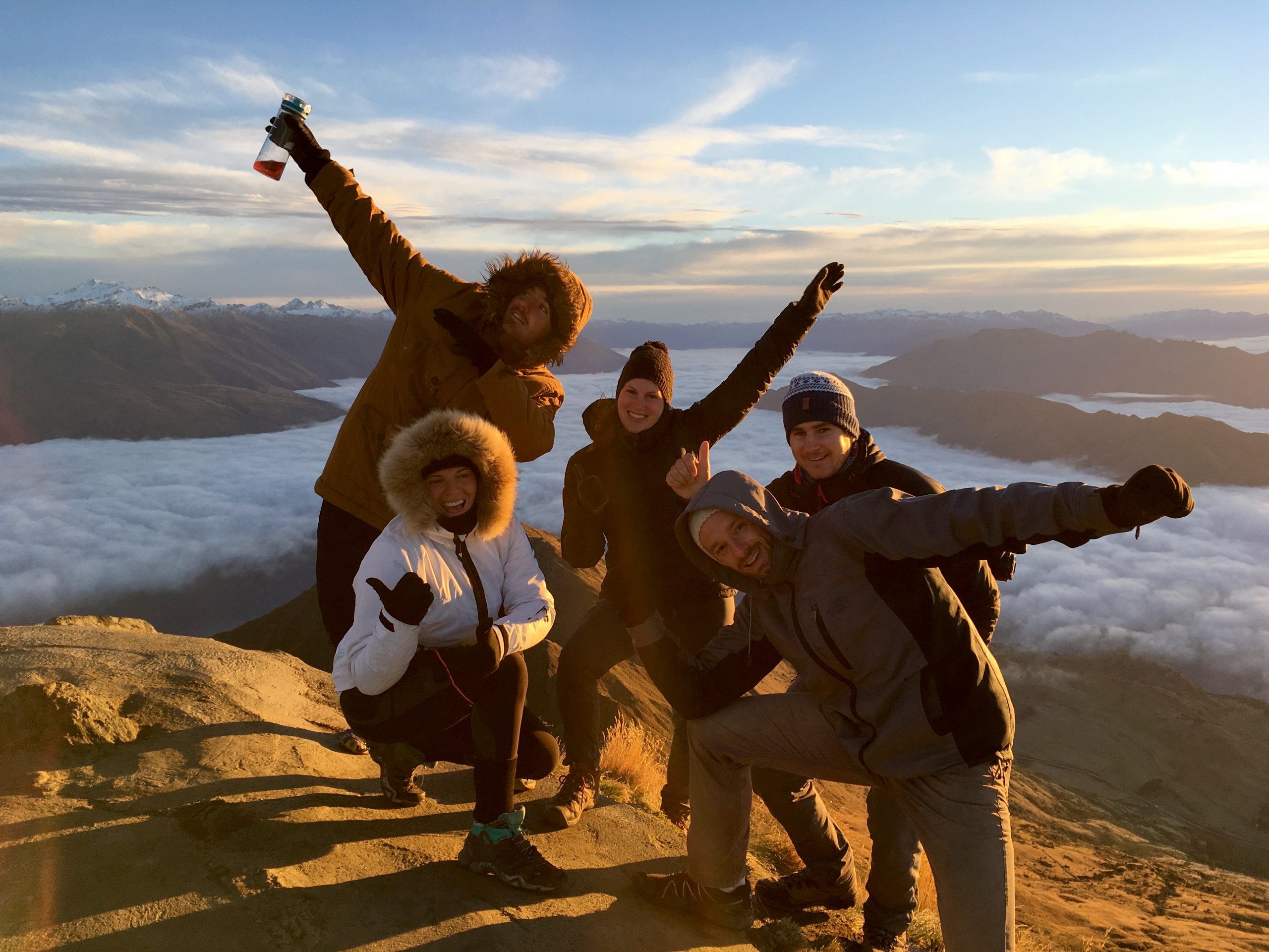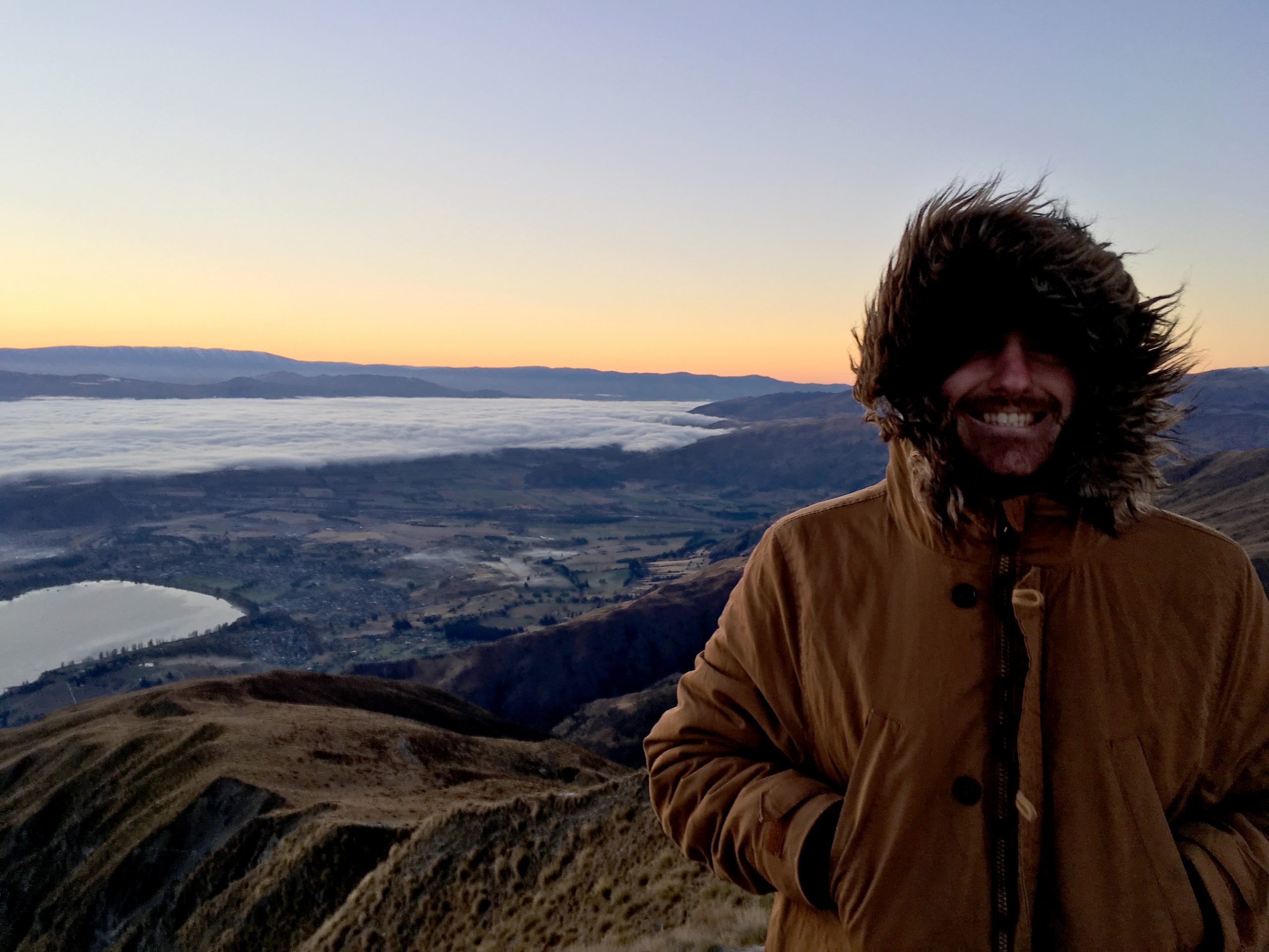 Lendemain matin, réveil à 3h30 du matin. Je pars pour une randonnée de nuit avec Valentin rencontré dans mon auberge la veille. A peu près réveillés, lampe torche sur le front, nous voici partis pour 2h30 d’ascension, direction « Roys Peak ». La marche en soit n’est pas du tout compliquée, il s’agit de sentier large, sans difficultés majeures. Cependant la constante montée et mes jambes fatiguées des dernières randonnées, ont rendu cette montée difficile. J’arrive donc au sommet avant le lever du soleil comme prévu. Peu de temps après, David et Karina nous rejoignent. On allume le réchaud ! je crois que cela faisait longtemps que je n’avais pas autant apprécié une boisson chaude ! Avec le vent, la température ressentie devait se rapprocher des -7/-10 degrés. Le spectacle est tout simplement magique. Un lever de soleil au dessus de la mer de nuage, une bonne équipe, quoi demander de mieux ?