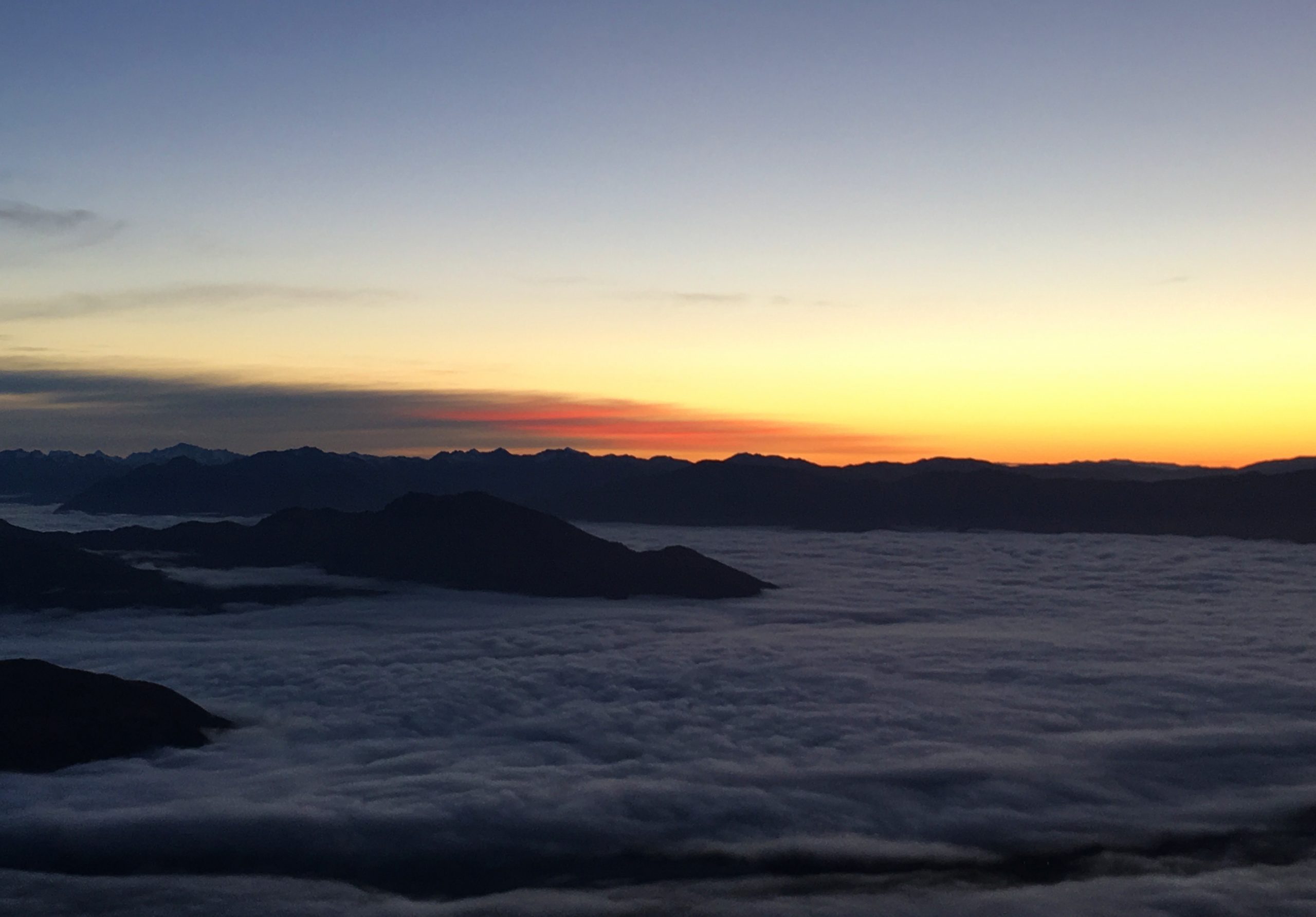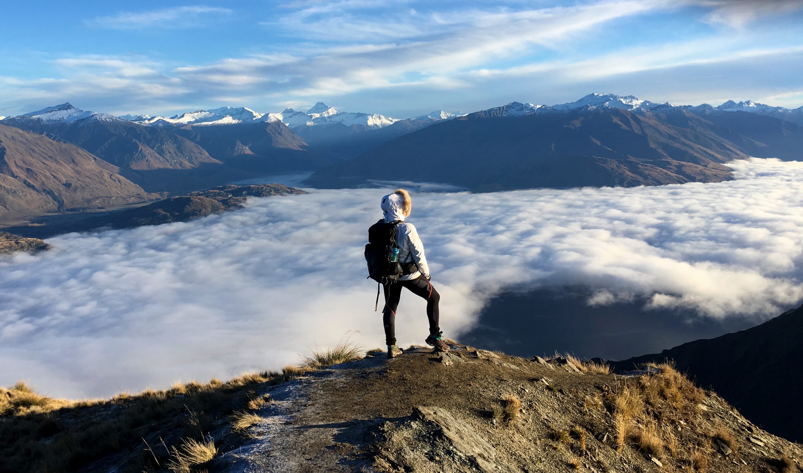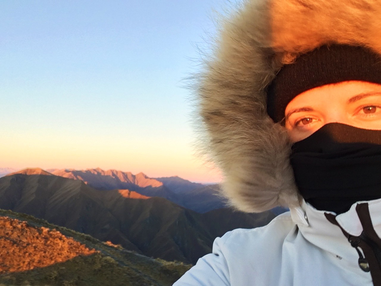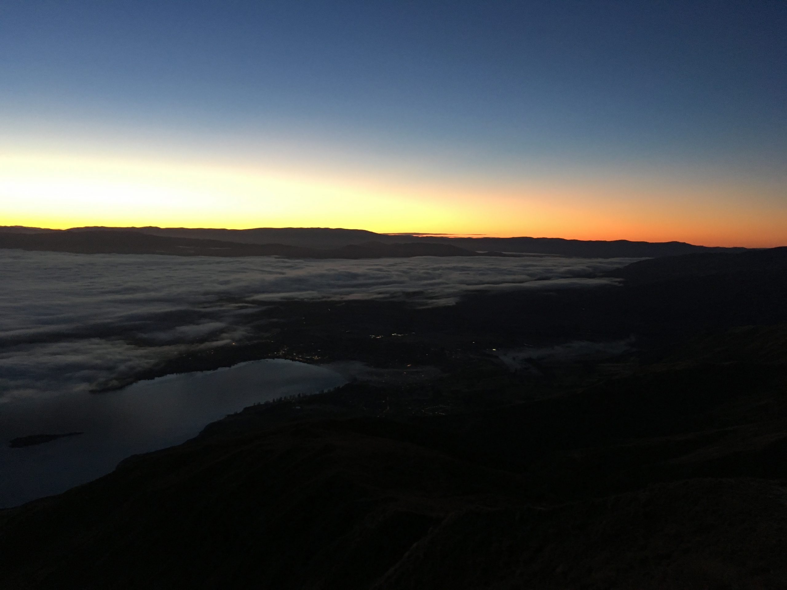 Lendemain matin, réveil à 3h30 du matin. Je pars pour une randonnée de nuit avec Valentin rencontré dans mon auberge la veille. A peu près réveillés, lampe torche sur le front, nous voici partis pour 2h30 d’ascension, direction « Roys Peak ». La marche en soit n’est pas du tout compliquée, il s’agit de sentier large, sans difficultés majeures. Cependant la constante montée et mes jambes fatiguées des dernières randonnées, ont rendu cette montée difficile. J’arrive donc au sommet avant le lever du soleil comme prévu. Peu de temps après, David et Karina nous rejoignent. On allume le réchaud ! je crois que cela faisait longtemps que je n’avais pas autant apprécié une boisson chaude ! Avec le vent, la température ressentie devait se rapprocher des -7/-10 degrés. Le spectacle est tout simplement magique. Un lever de soleil au dessus de la mer de nuage, une bonne équipe, quoi demander de mieux ?